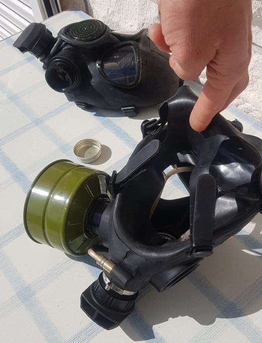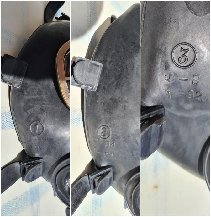 *Sve maske imaju drugačiju vrstu gumirane plastike na mjestu za ispuh zraka (ispupčeni dio ispred usta), koji je čvršći i krući, te se može i noktima zafrižat, i nakon toliko godina starosti, ispada kao da je korišteno i da je šporko, a nije.