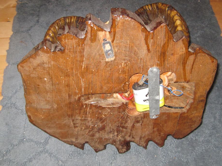 Glava je skuhana i iz nje je izvađeno sve tkivo . Nakon toga stajala je na zraku , kroz nju su provučene plastične cijevčice kroz koje idu kablovi i LED diode na jednom kraju , a na drugom je baterija 4,5 V i prekidač za palenje- gašenje serijski povezan . Sve je to zaliveno u gips , obrađeno , obojano bezbojnim lakom i pričvršćeno za grubo obrađenu drvenu podlogu da bi djelovalo prirodnije ..
