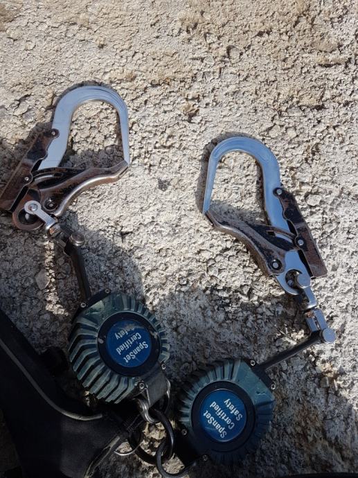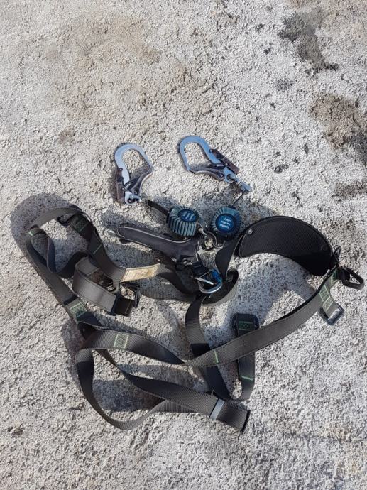 Harnes; sigurnosni pojas za vezanje za sigurnost na visinama. Pojas je namjenjen za vezanje oko nogu i ramena i ima zatezače sa kukama za kvačenje.