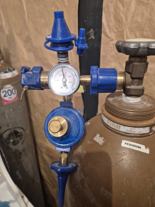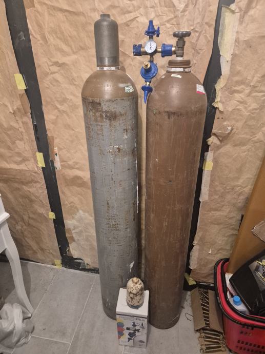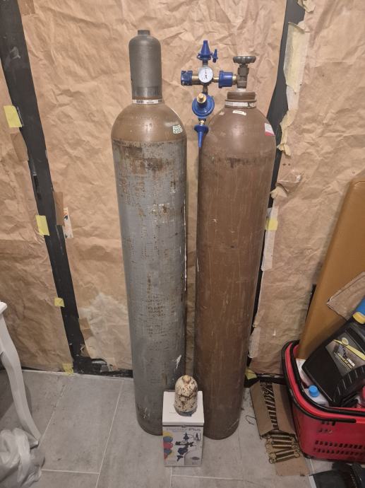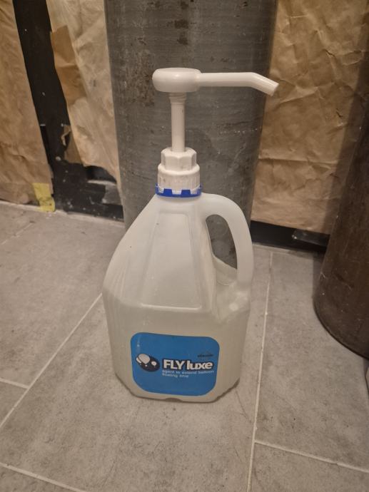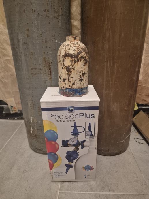 Dvije boce helij, jedna puna sta je vidljivo na slikama, dvije nove navlake za bocu, tekućina za helij i novi manometar (koristen par puta sta je potrošenu helij iz boce)