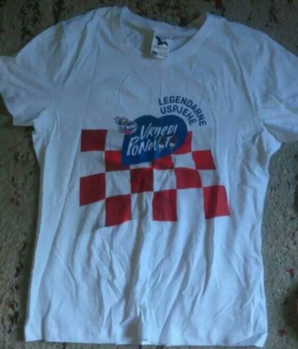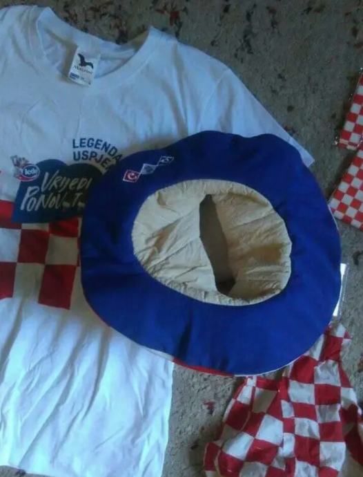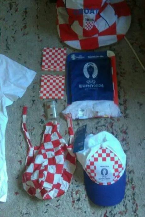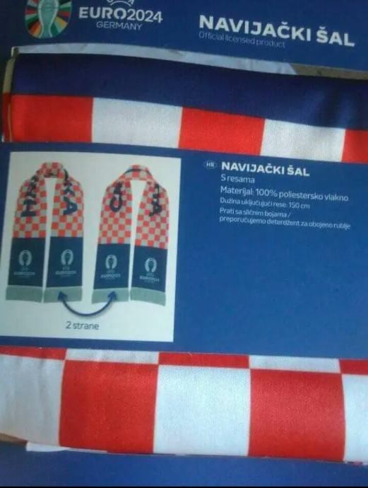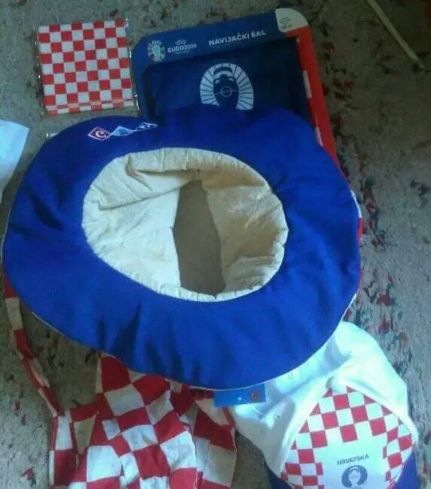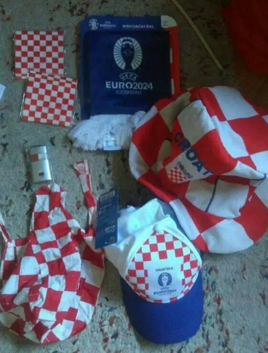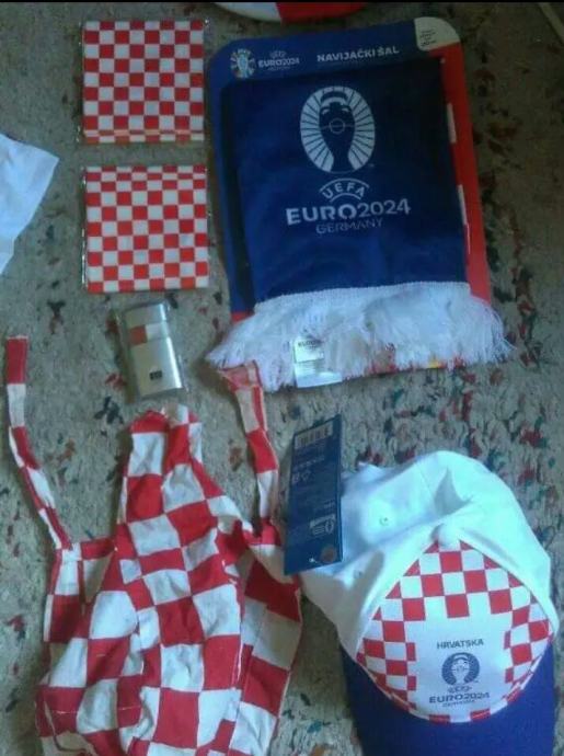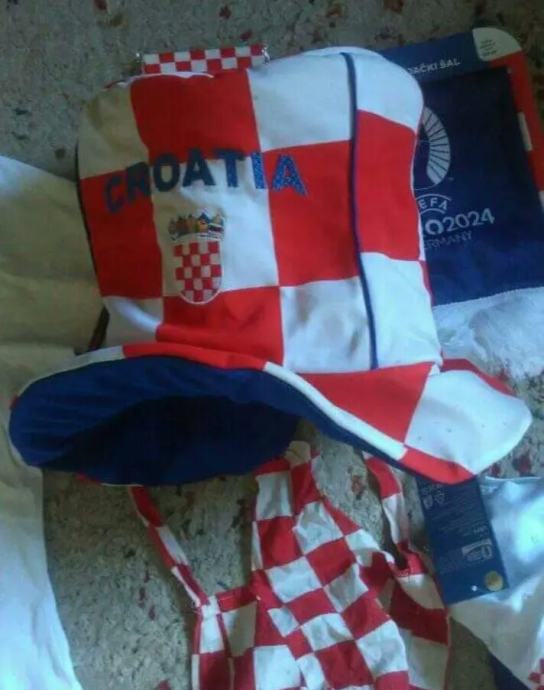Hrvatska kapa 10 eura,Hrvatska marama 7eu,boja za lice Hrvatska crvena i bijela 7eura,Hrvatska sal 150cm 13eura,Croatia sesir XL 20eura,Hrvatska dvije navijacke udaraljke na napuhavanje 5eura,Hrvatska majica L 13eura.Saljem postom,placanje pouzecem.Kupac placa troskove postarine.