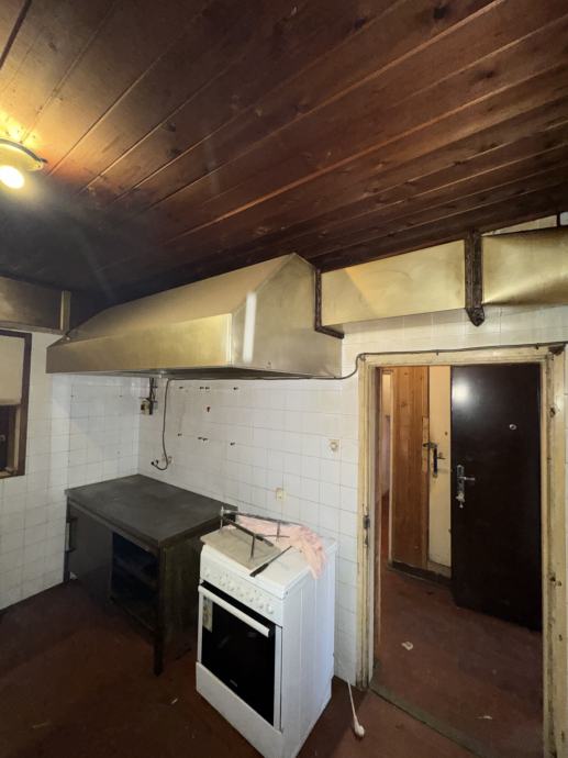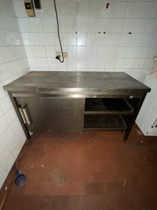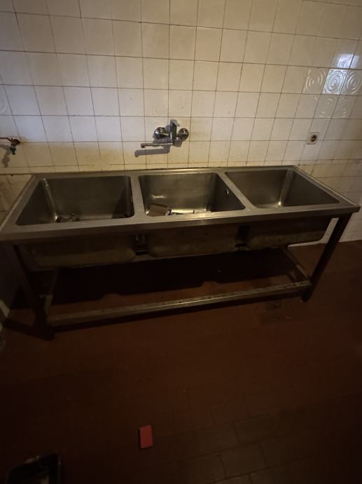 Dupli sudoper,radni stol s ladicama,ventilacija s haubom,stol za otpad i panj za pripremu hrane ili sječu pečenja.