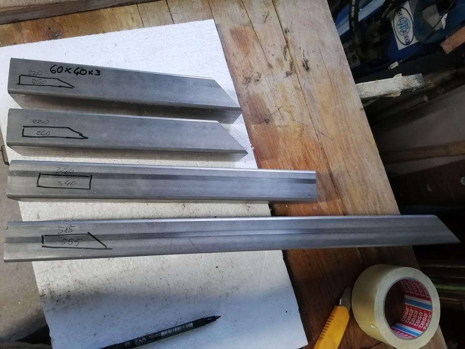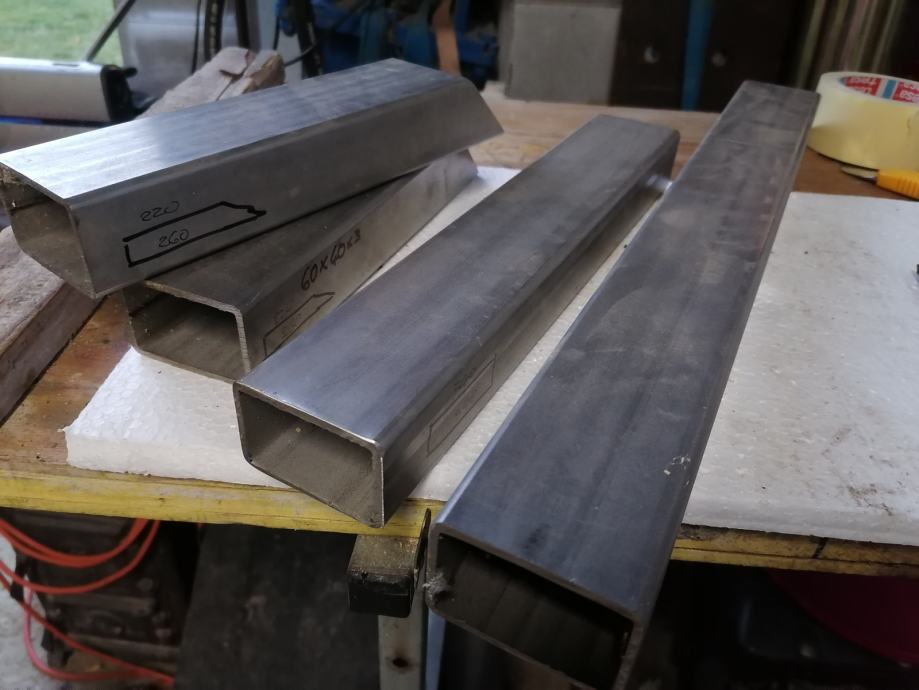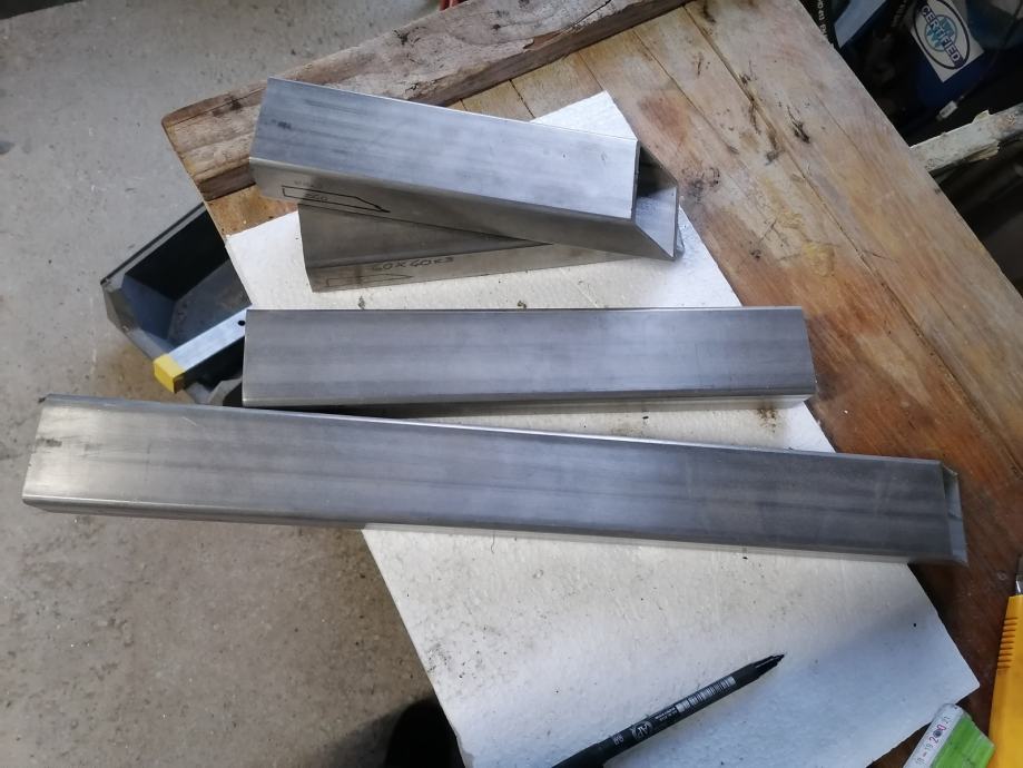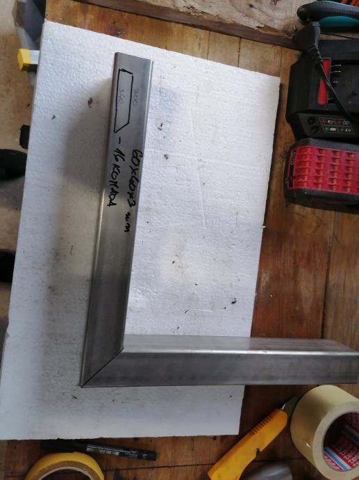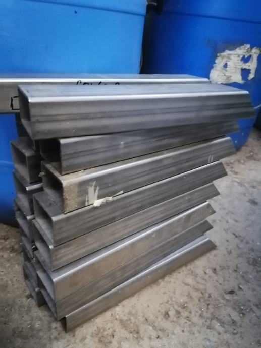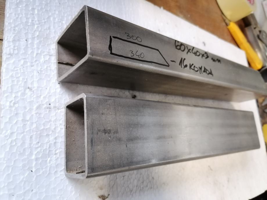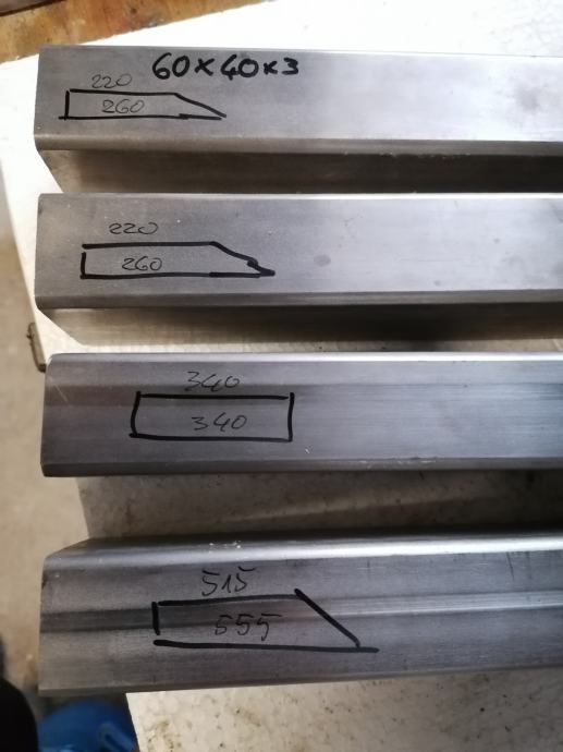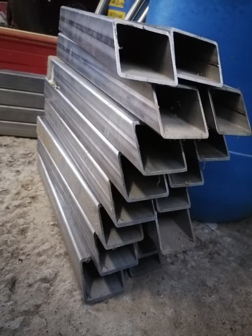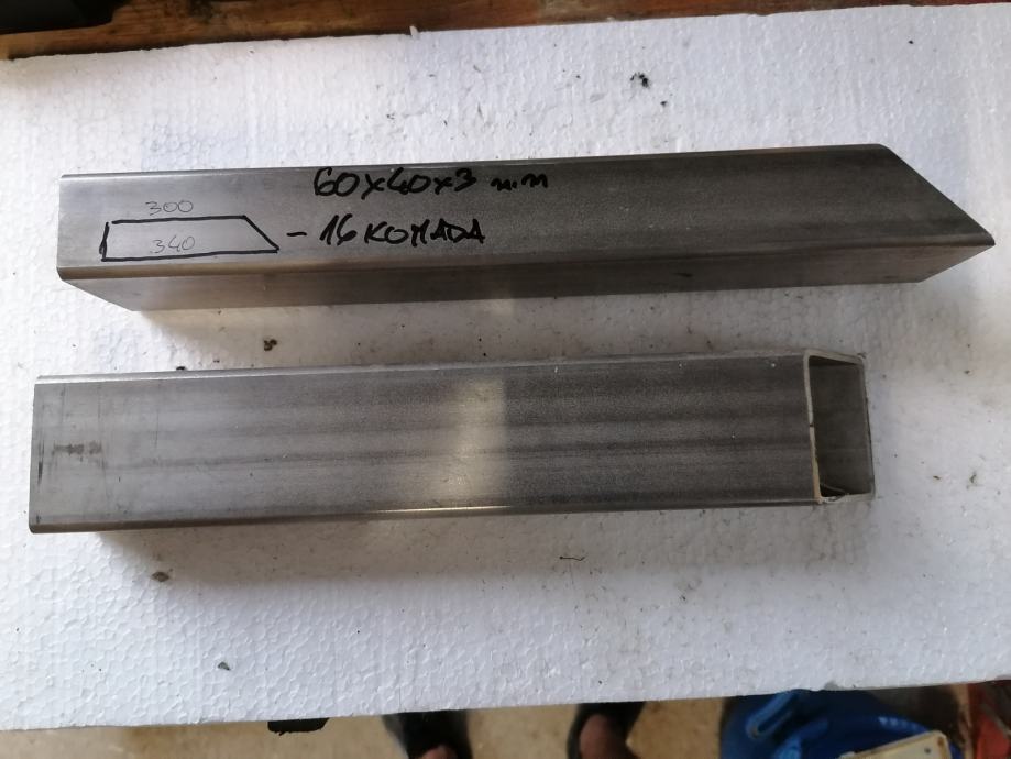 Inox pravokutna cijev 60×40 mm i 3 mm debljina stjenke. 10 komada dužine 340 mm, jedna strana odrezana pod kutem od 45 stupnjeva.