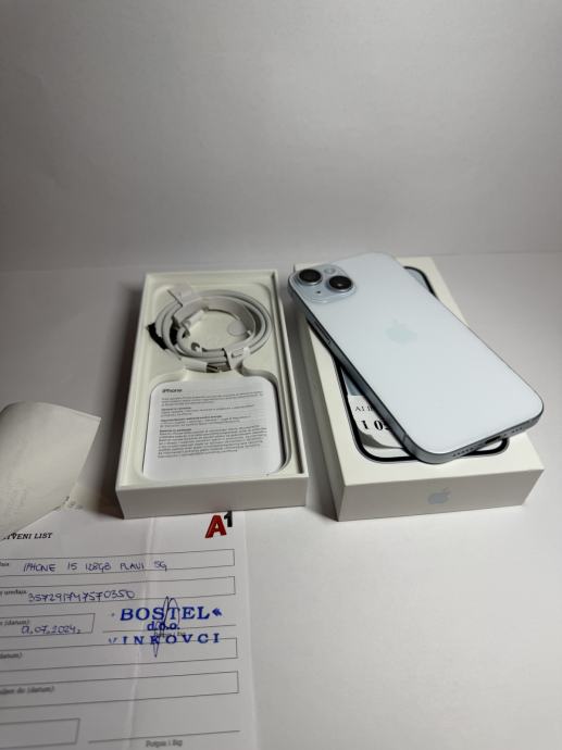 Prodajem iPhone 15 128GB u plavoj boji. Mobitel je potpuno ispravan, bez ikakvih problema u radu.