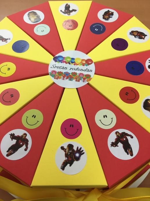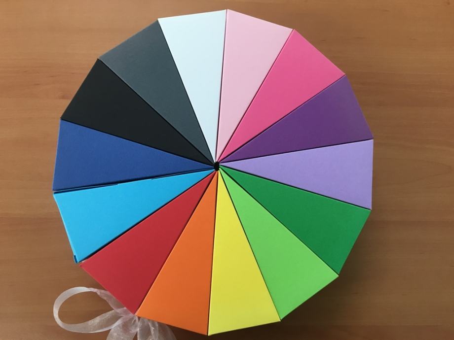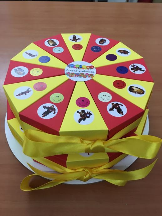 Samosložive kutijice (nema ljepljenja) u obliku kriške torte izrađene od 250 gramskog hamer papira u 14 boja koje birate po želji (zadnja slika u galeriji).