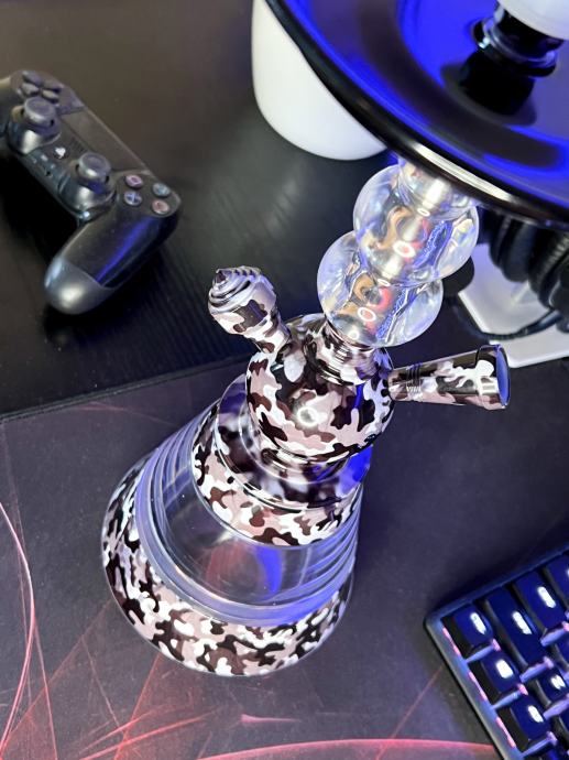 Nova zapakirana Junior 2.0 komplet Nargila / shisha, ukljucuje camo bazu nargile, crno gumeno crijevo sa usnikom, mala keramicka glava i duge stangice za ugljen. Odlicna za pocetnike, mala i kompaktna za putovanja.