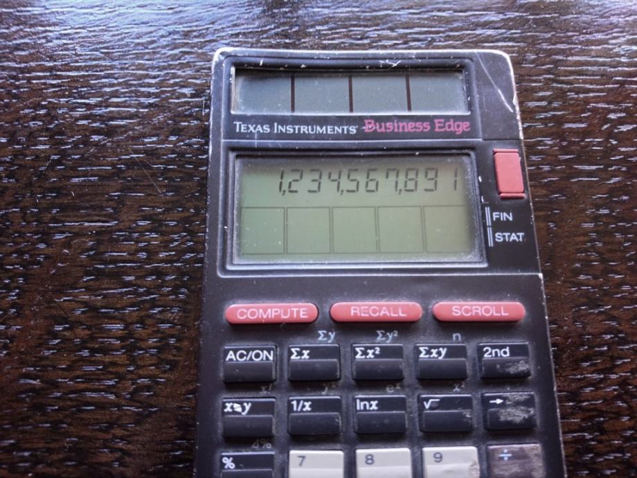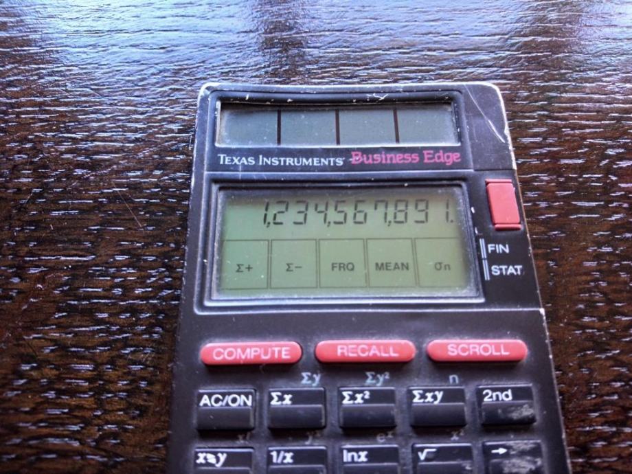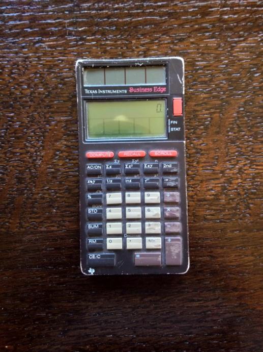 Kalkulator je američke kompanije Texas Instruments, model Business Edge. Proizveden je u Tajvanu. Namijenjen je financijskom i statističkom računanju. Dobio sam ga negdje prije sredine ili sredinom 90-ih.