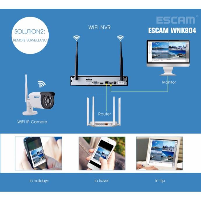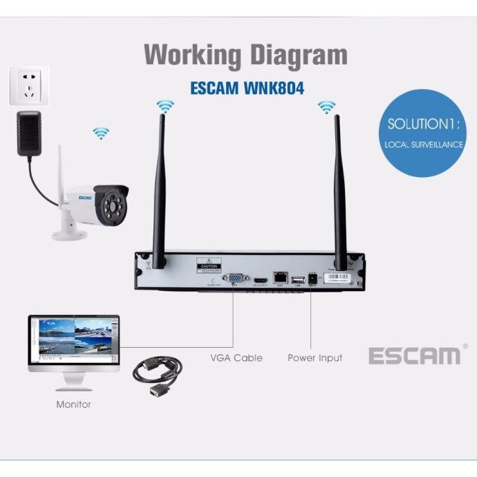 Osim napajanja video nadzor ESCAM WNK804 je u potpunosti bežičan što pridonosi jednostavnosti montaže. NVR snimač dolazi s predinstaliranim programom za video nadzor te za uparivanje kamera nisu potrebni dodatni postupci.