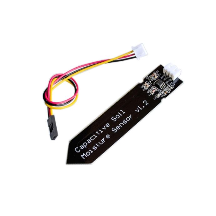 Kapacitativni senzor vlažnosti tla s analognim izlazom 0~3 V, napajanje 3.3~5.5 V, s 3-pinskim Gravity konektorom i Gravity na Dupont 3-pinskim kabelom. Dimenzije pločice su 98x23 mm.