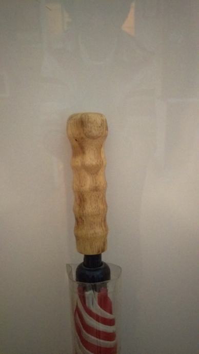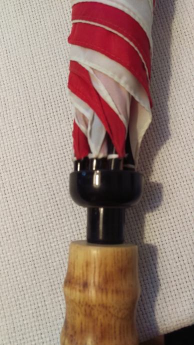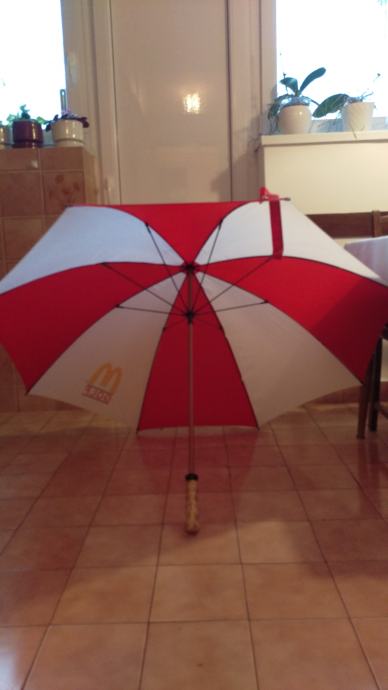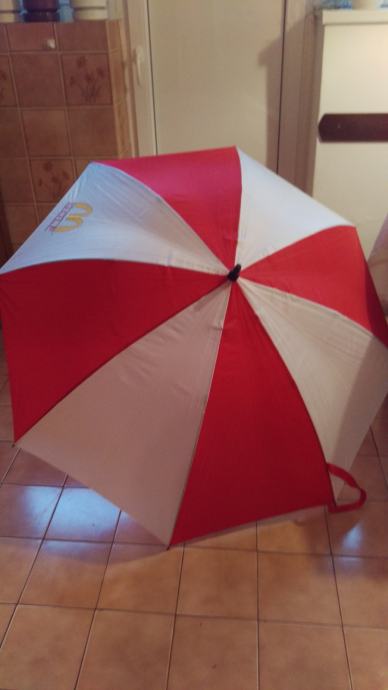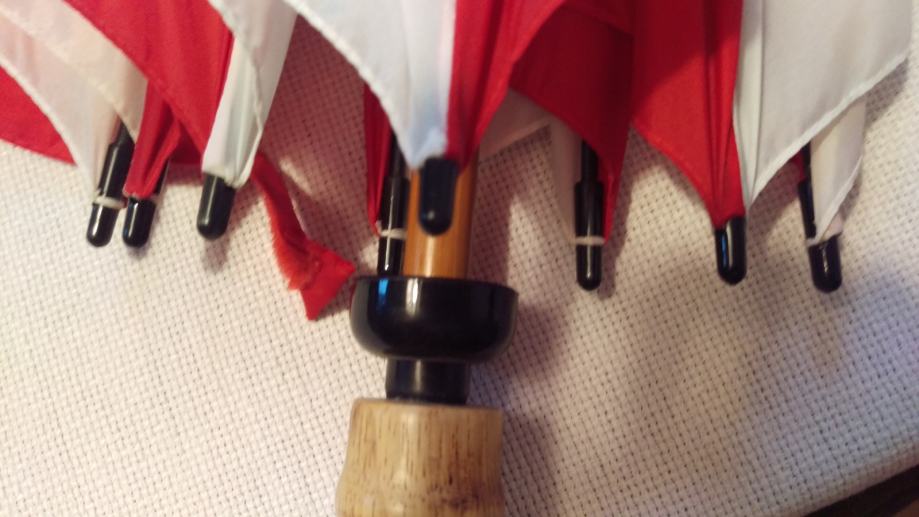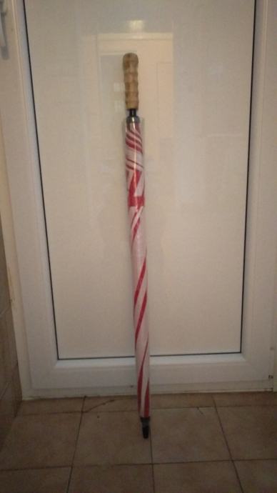 Prodajem NOVI kišobran u plastičnoj futroli. Isti sam otvorila samo radi slikanja. Mjeren dok je zatvoren polumjer je cca 55cm. Promjer otvorenog je cca 115 cm, u crveno-bijeloj je boji, ima lakirani drveni nosač i drvenu ručku. Kad je zatvoren ima kružni držač za krajeve žica, tako da ne mora imati futrolu.
