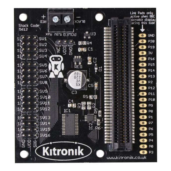 Uz pomoć ove pločice možete kontrolirati do 16 servo motora te napraviti velike i napredne robotičke projekte bazirane na BBC Micro:bitu. Svih 16 priključenih servo motora napaja se direktno preko ove pločice kojoj je potrebno 3-5.5 V napajanje koje se priključuje ili putem terminala ili putem pinova za napajanje iza terminala. Svi pinovi BBC Micro:bita izvedeni su na rubu pločice i omogućuju spajanje drugih dodataka/pločica za Micro:bit.