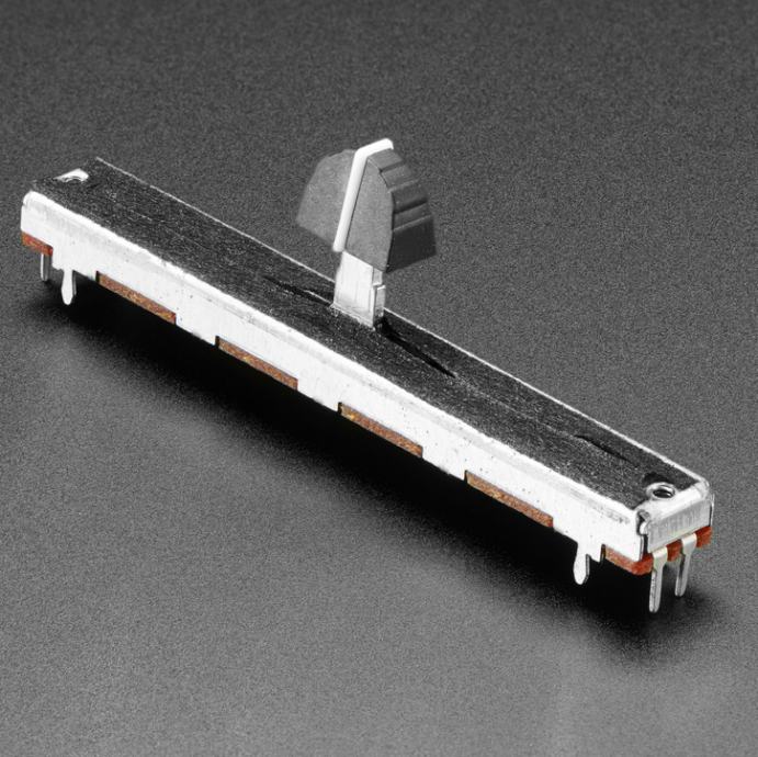 Klizni potenciometar duljine 75 mm, može se koristiti i na eksperimentalnoj poločici, dolazi s plastičnom kapicom.