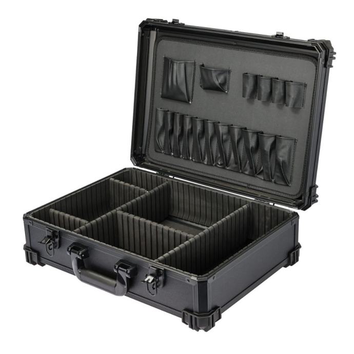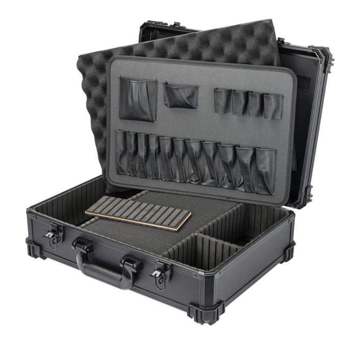 Za dodatnu sigurnost, kofer ima dvije kopče s ušicama za lokote, čime možete sigurno zaključati kofer i osigurati sadržaj. Ergonomska ručka omogućava udoban prijenos, čak i kada je kofer potpuno napunjen. S dimenzijama od 46 x 33 x 15 cm i težinom od 2,9 kg, ovaj kofer je kompaktan, ali dovoljno prostoran za pohranu svih vaših alata.