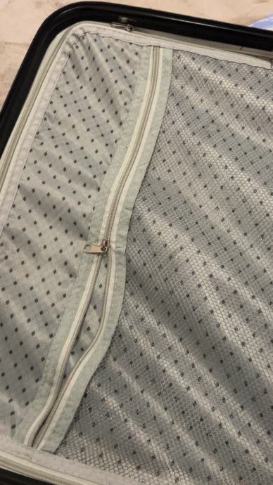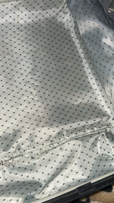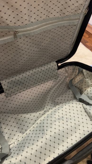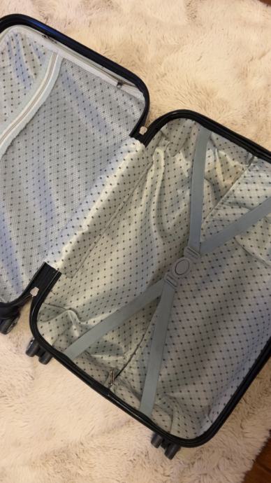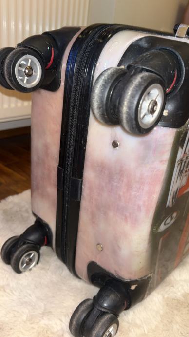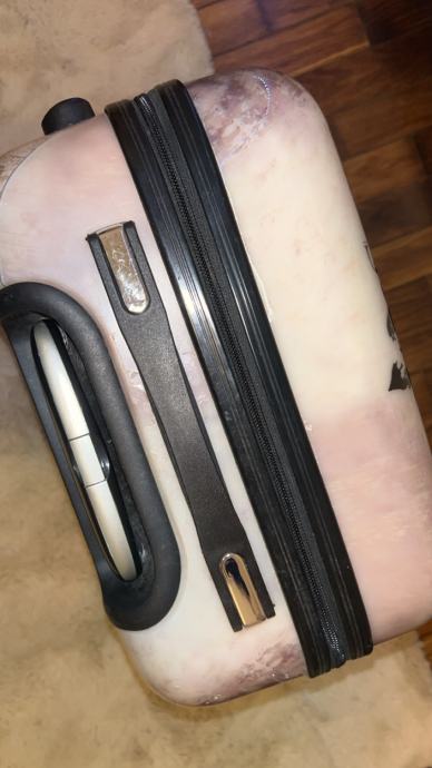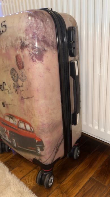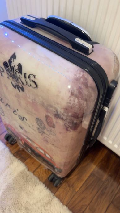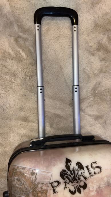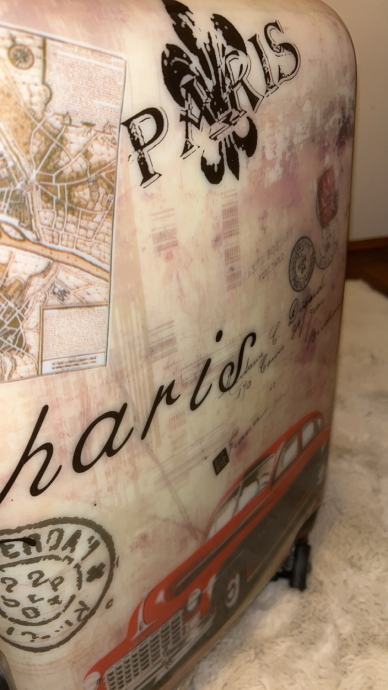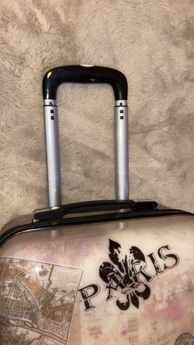 Lakirani kofer s uzorkom parisa. U savršenom stanju, sve funkcionira. Korišten za par putovanja. Čvrst s podesivom ručkom te s tri prostora za stvari.