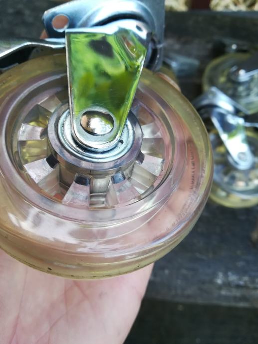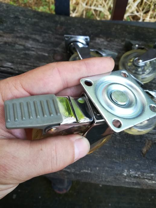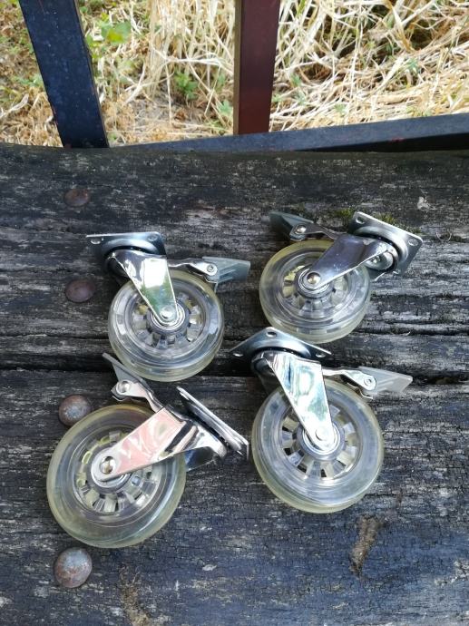Kotači za namještaj, ukupne visine 9cm. Imaju kočnicu. Kotači su od prozirne gumaste plastike. Svi su super očuvani i bez ikakvog oštećenja. Sve zajedno košta 40eura. Cijena je fiksna. Na sms nemogu odgovoriti, najbolje bi bilo da me nazovete 099 687 5657 ili pošaljete poruku preko Njuškala. Kotači, kotačići, transportni kotači.