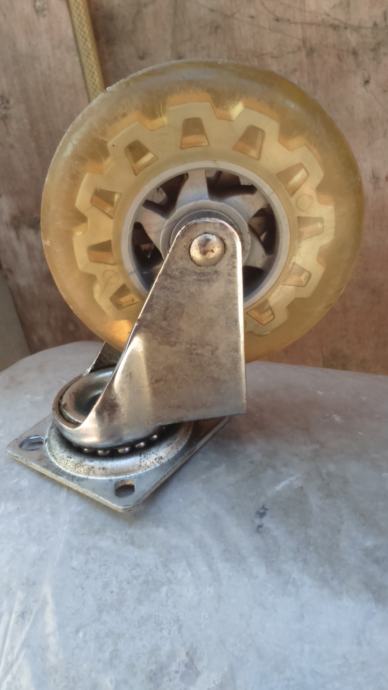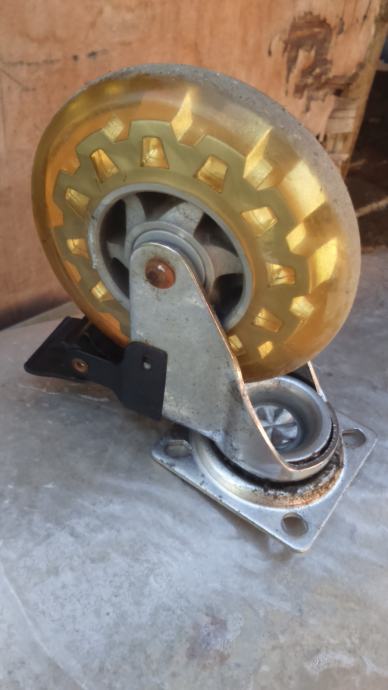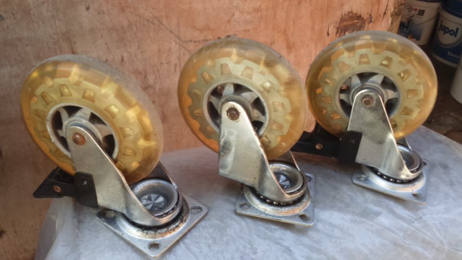 Prodajem tri komada ispravnih rabljenih zakretnih transportnih kotačića pvc s unutrašnjim ojačanjima, prozirni. Dva s kočnicom i jedan bez kočnice. Promjer kotača je 100mm, ukupna visina 120mm i metalne nosive kvadratne pločice 60x60mm. Prilog fotografije. Gornja Dubrava Zagreb