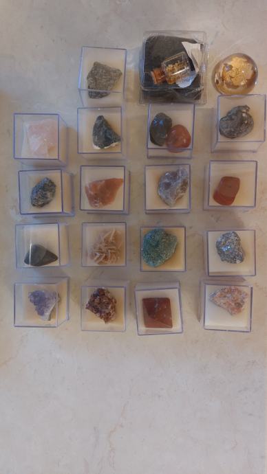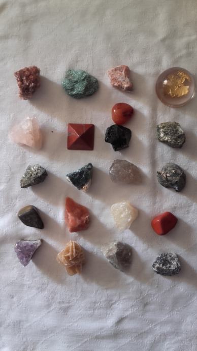 Prodajem zbirku minerala i kristala.Zbirka se sastoji od: ametist,tigrovo oko,pirit,ružičnjak,aragonit,pustinjska ruža,halit,apatit,karneol,fuksit,galenit,opsidijan,kalcit,fluorit,crveni jaspis,kalcedon,labradorit,zlato-listići 2×.