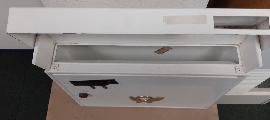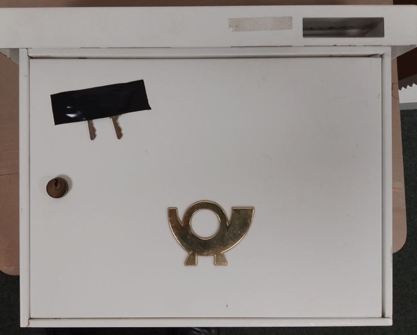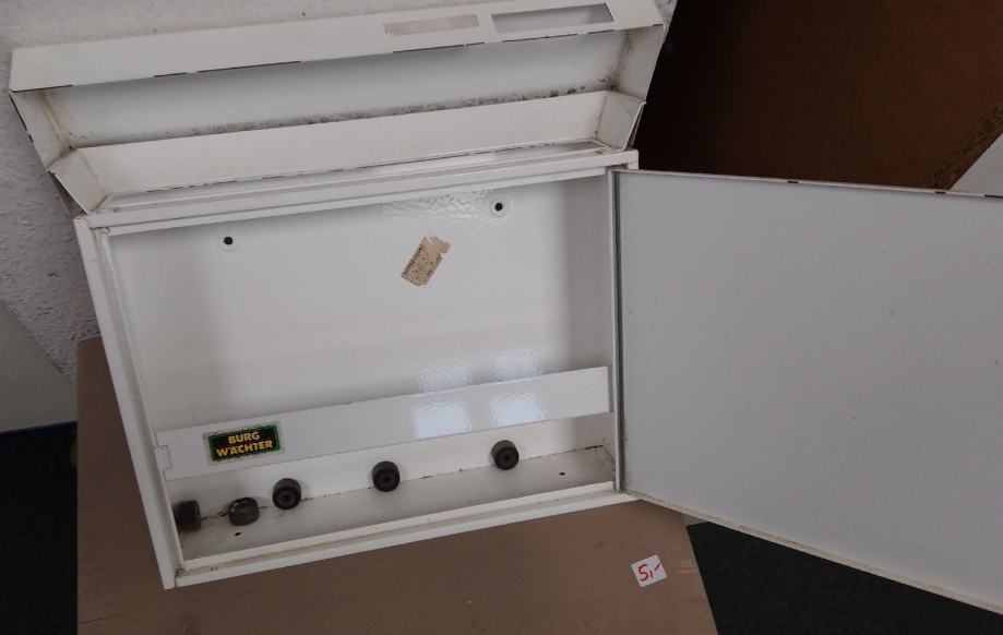 extra dobro sačuvan veći metalni bijeli Deutsche Post sandučić sa mesinganim logotipom trube, dva ključa i prozorčićem za natpis ili ime, 4x gumeni podmetač za razmak kod pričvršćena na podlogu.