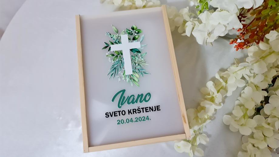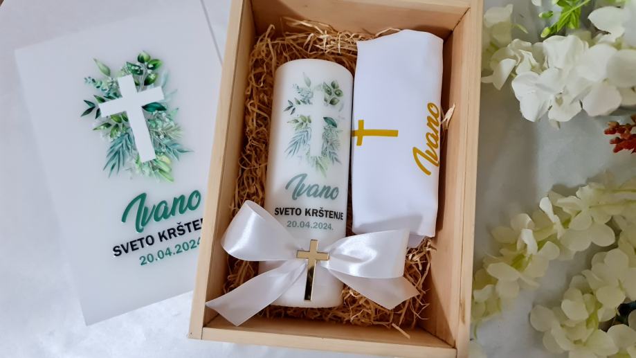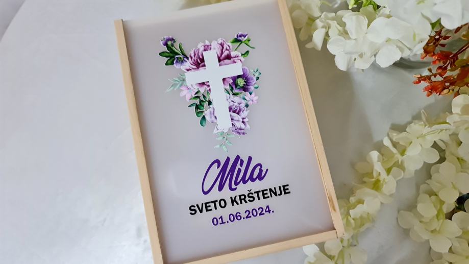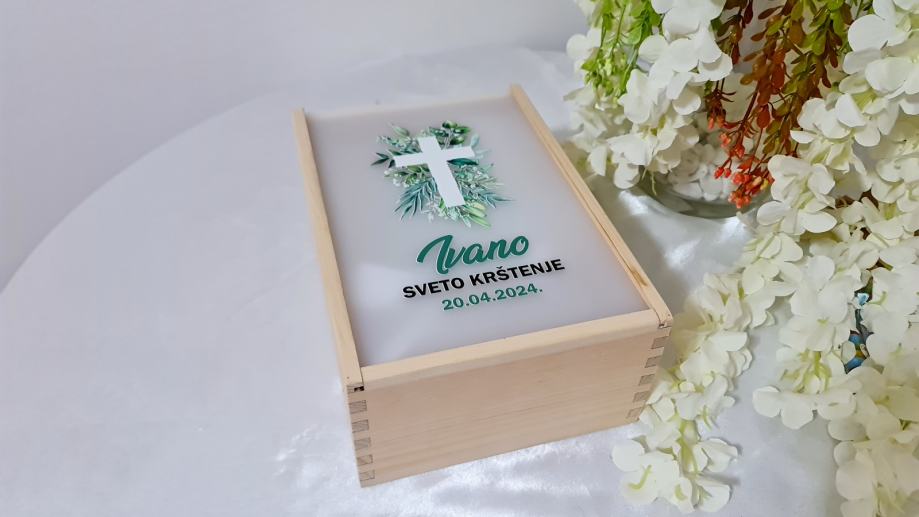 - Personaliziranu drvenu kutiju s imenom i datumom, s poklopcem od pleksiglasa i dizajnom prema željama