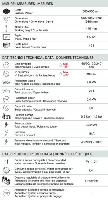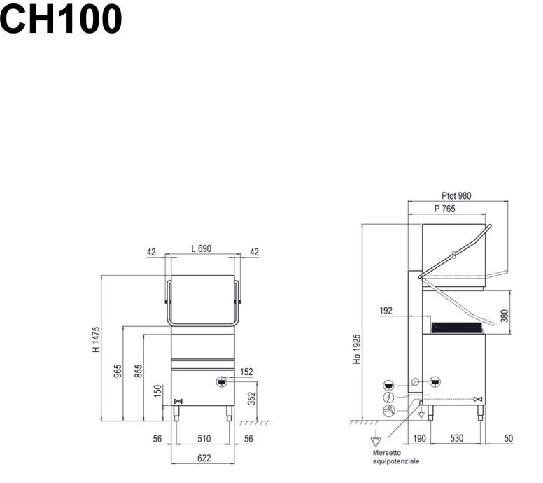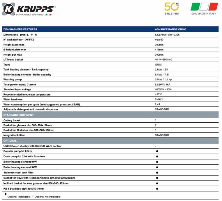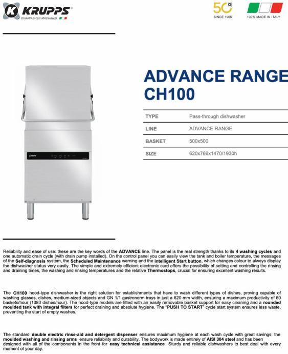 S podiznom haubom CH100 može oprati do 60 košara po satu, uključujući čaše, tanjure, srednje velike objekte i GN 1/1 gastronorm pladnjeve. Njena kompaktna širina od samo 620 mm čini je idealnom za male prostore. Opremljena je visokoučinkovitom pumpom za pranje i lako uklonjivim košarama za jednostavno čišćenje.