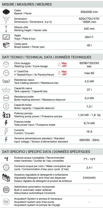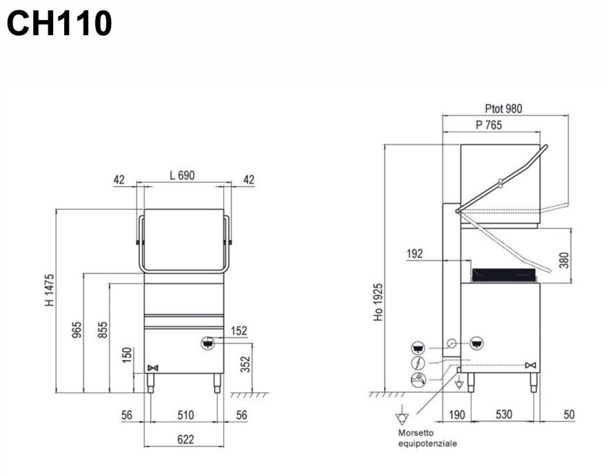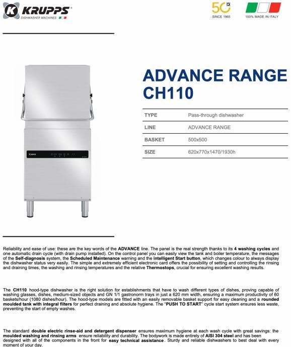 S podiznom haubom CH110 može oprati do 60 košara po satu, uključujući čaše, tanjure i GN 1/1 pladnjeve. Kompaktna širina od 620 mm čini je idealnom za male prostore. Izrađena je od inoxa AISI 304, s dvostrukim dozatorima za deterdžent i sredstvo za ispiranje koji osiguravaju maksimalnu higijenu.