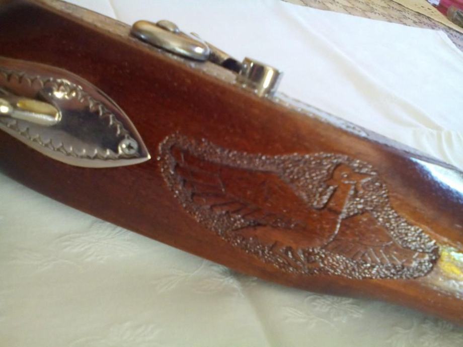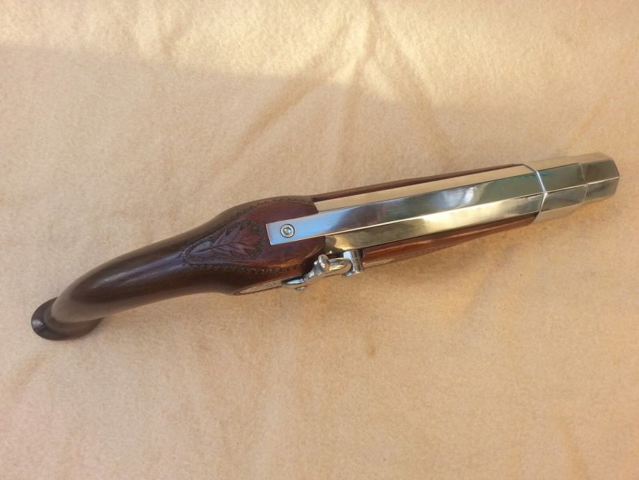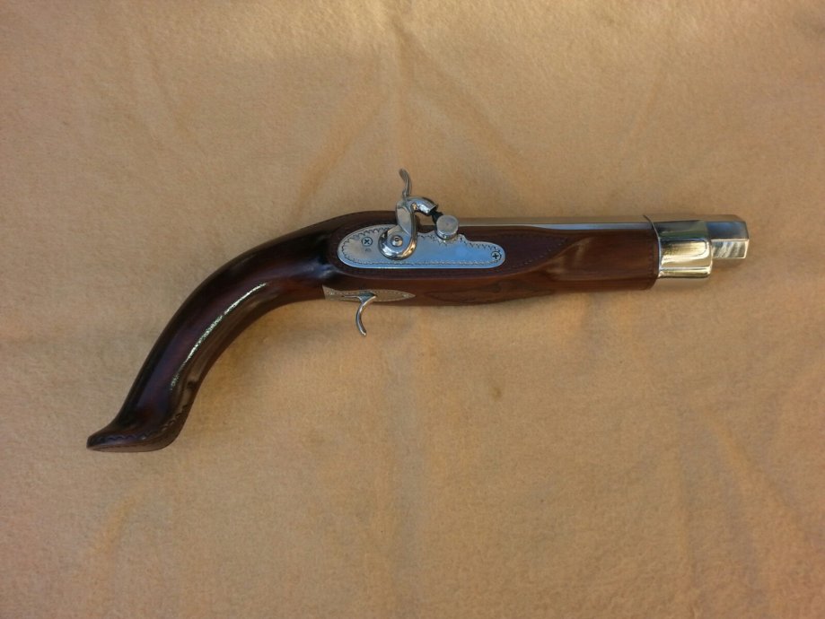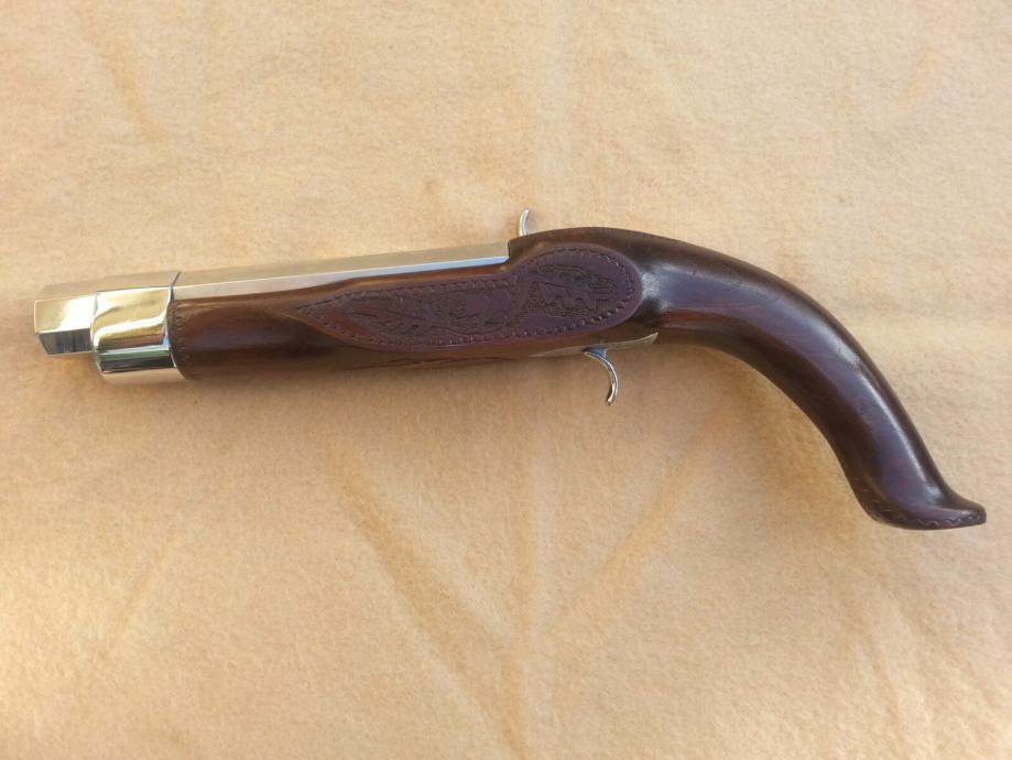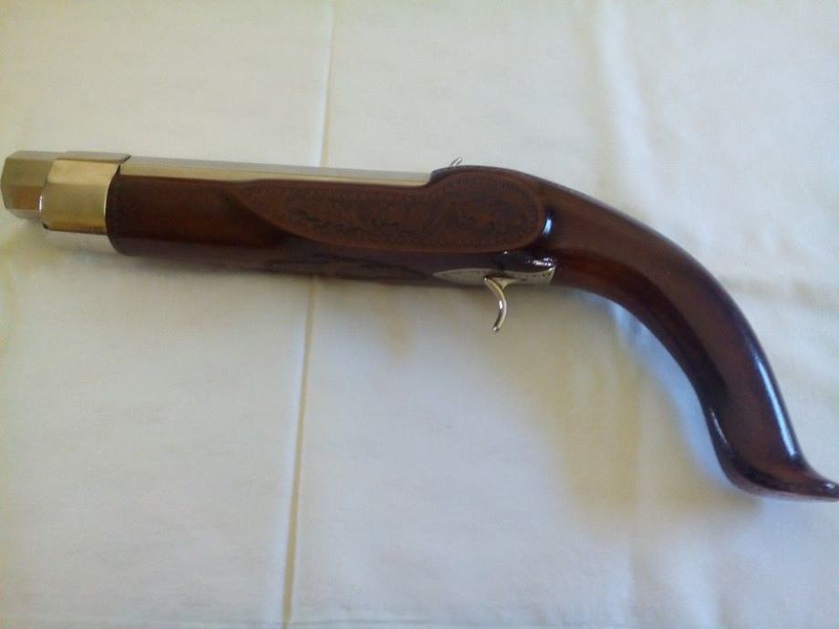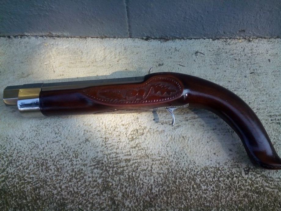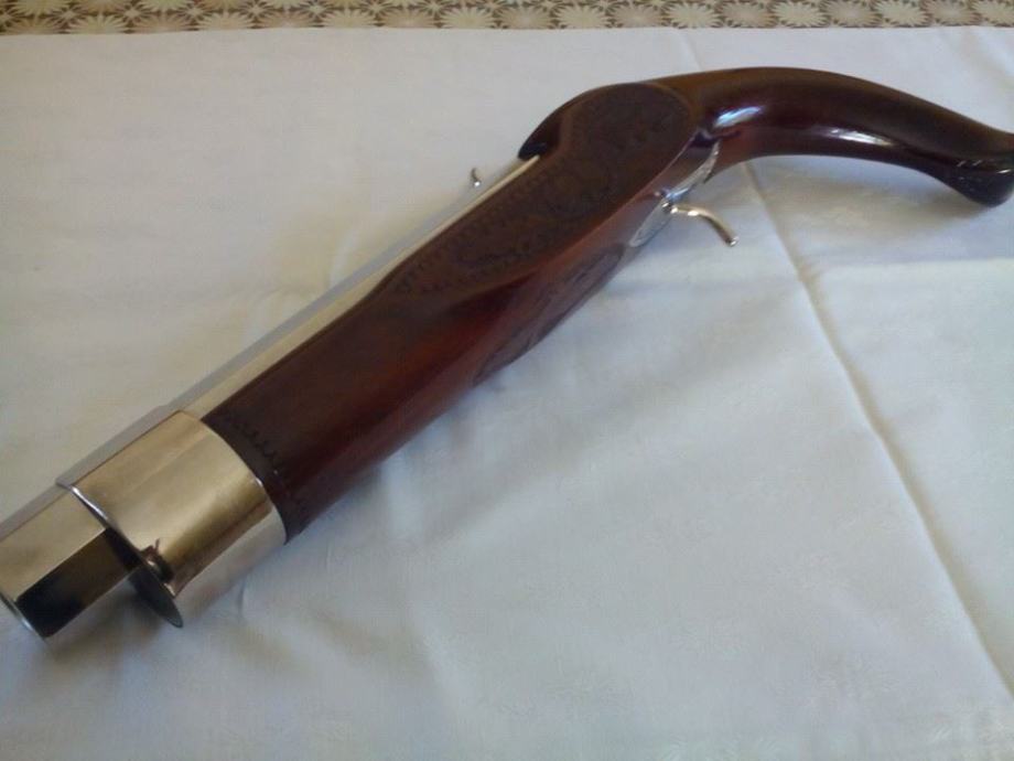Prodajem nekorištenu kuburu. Promjer rupe u cijevi iznosi 23mm. Kubura je srednje veličine, izrađena je od orahovog drva i sjajno poliranog inoxa.