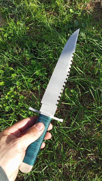 Nož izrađen od vrlo izdržljivog 80crv2 čelika,full Tang konstrukcija,završna obrada je pjeskareno,35 cm ukupna dužina od toga 12 cm ide na ručku koja je izrađena od oraha i preko nje je namotana debeli konac,futrola je goveđa koža bojana i lakirana u crno.