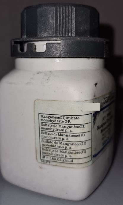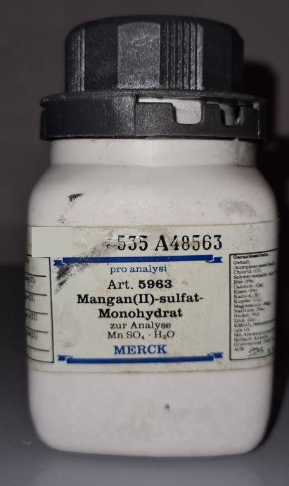 Manganov(II) sulfat monohidrat (MnSO4 X H2O) je najstabilniji manganov spoj iako topljiv u vodi. Dobiva se reakcijom piroluzita i sulfatne kiseline. Bezvodan je kristal (na zraku gubi vodu) bijele do blago ružičaste boje, a hidroliziran s jednom, dvije, četiri, pet ili sedam molekula vode postaje ružičast.