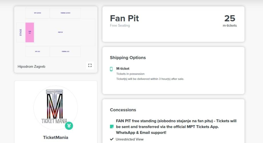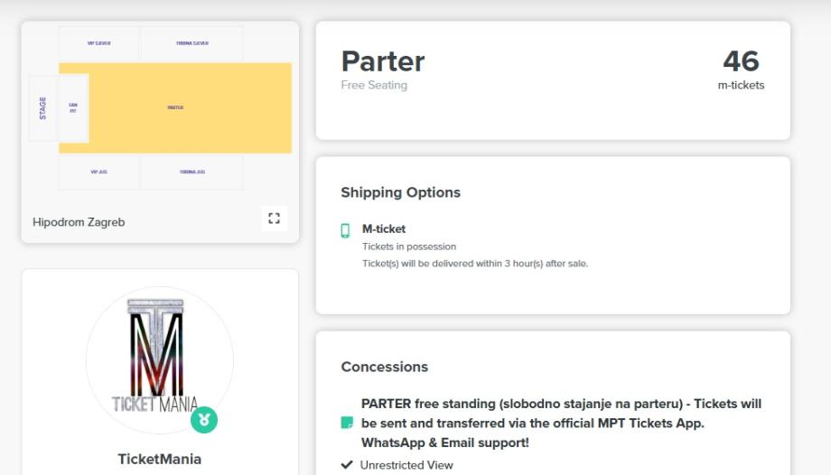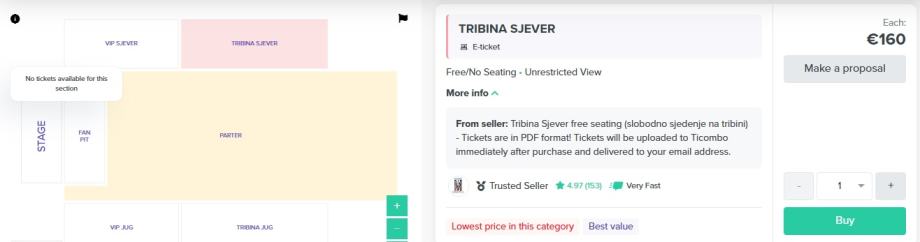 Sve dostupne ulaznice oglašene su isključivo na Ticombo stranici te dostupne za neposrednu kupnju.