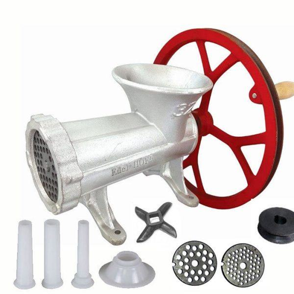 Najvažniji dio stroja je savršeno usklađen pužni prijenosnik postavljen na ležaj, koji polaganim okretanjem (ručno pokretan radilicom / kotačem ili motorom) pomiče komade mesa u smjeru noževa za rezanje mesa, koji se okreću zajedno s pužnim prijenosnikom i pritisnuti su diskom s malim rupama s oštrim rubovima.