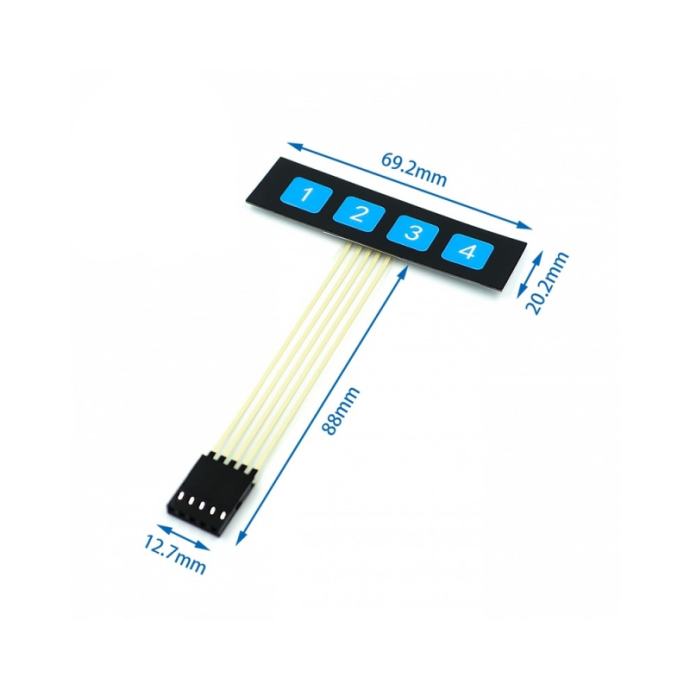 Ovo je jednostavna tipkovnica s 4 tipke, a pošto svaka tipka ima svoju žicu, nije potrebno kodirati matricu za prepoznavanje, može se tretirati kao četiri neovisne tipke. Tipkovnica je samoljepiva pa ju možete vrlo jednostavno dodati na bilo koje kućište.