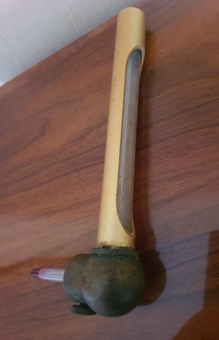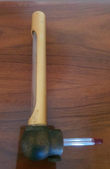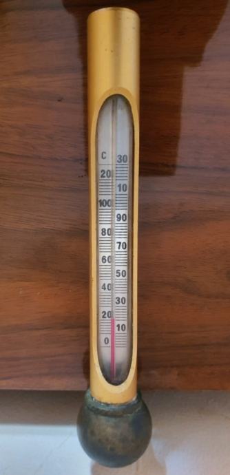 Prodajem mesingani termometar s karakterističnim okruglim postoljem na dnu. Skala termometra prikazuje vrijednosti od 0 do 130°C