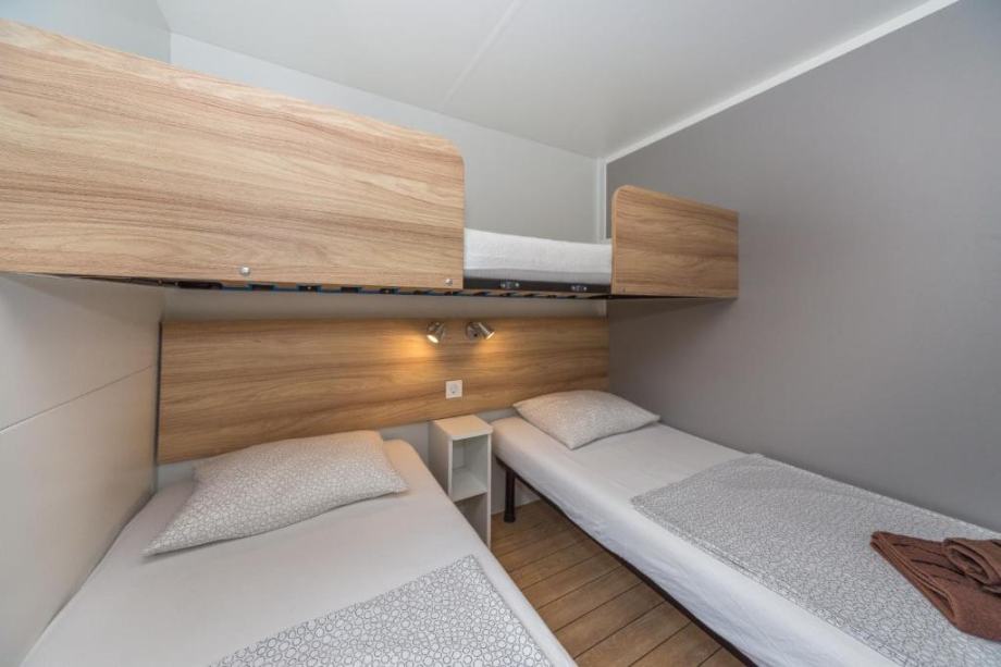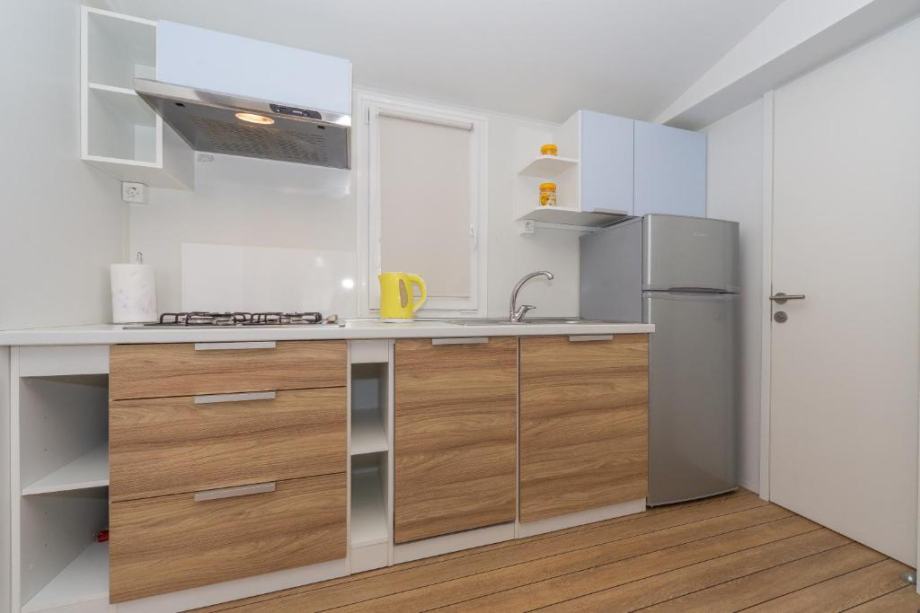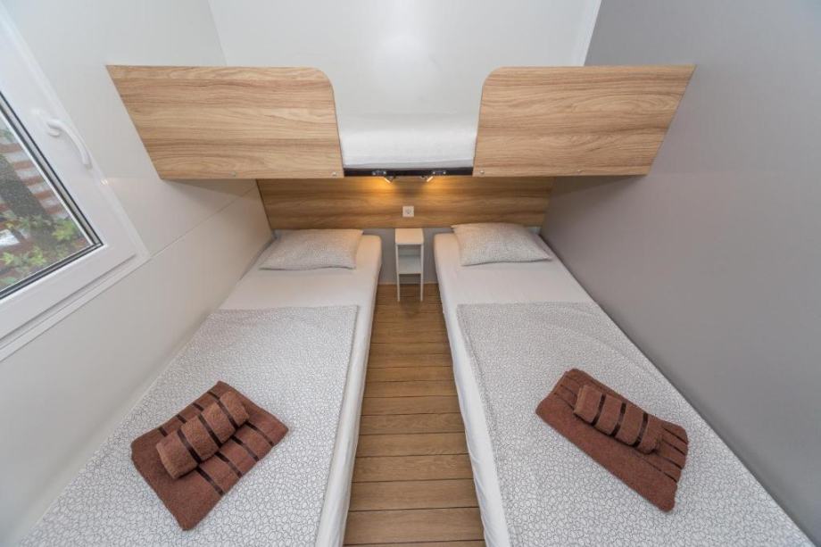 Kućica se sastoji od 2 spavaće sobe (od koje jedna ima veliki krevet sa madracom velicine 200x160 a druga 2 ležaja sa madracima velicine 200x80 te krevetom na kat i madraca iste dimenzije), velike kuhinje sa blagavaonom i dnevnim boravkom (+ kauč/krevet na razvlačenje za dvije osobe), 2 komforne kupaonice sa tus kabinom i wc-om, te velike prostrane natkrivene terase sa stolom i stolicama za 6-8 osoba te vrtnom kutnom garniturom.