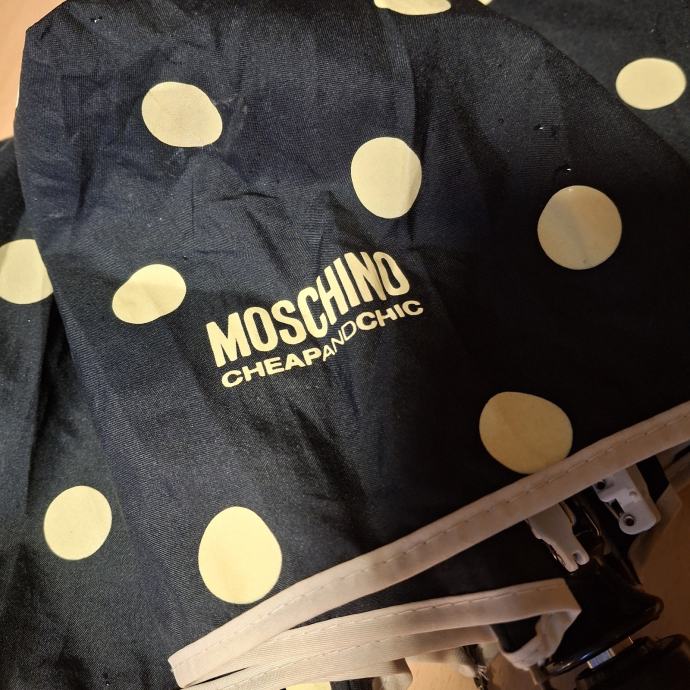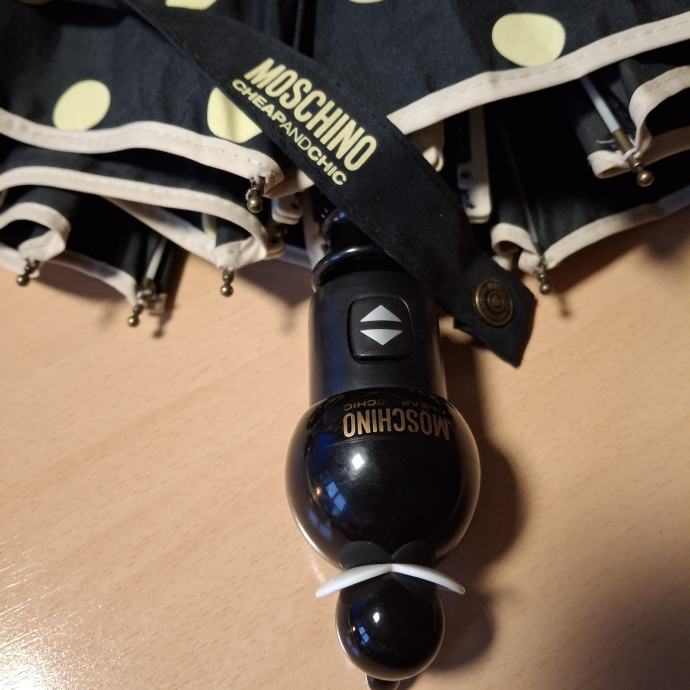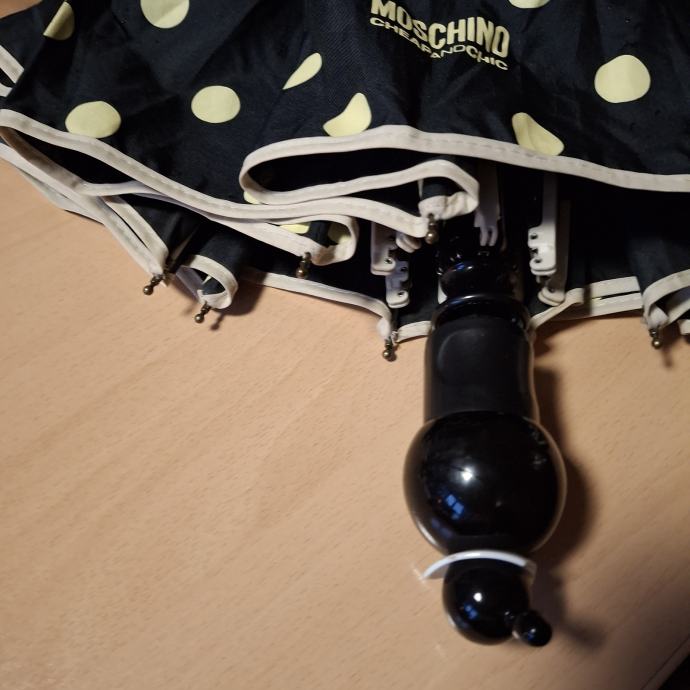 Mali kišobran Moschino.Uzorak crno bež točke, ručka kišobrana u obliku Olive. Kratko korišten