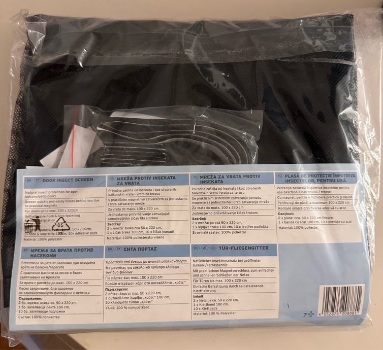 Prodajem crnu mrežicu protiv komaraca za vrata do 100x220 cm koja se fiksira samoljepljivim čičkom.