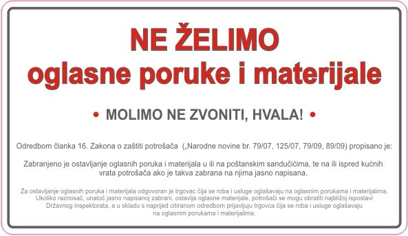 u koji želimo da nam raznosači ne ulaze i stavljaju reklamne materijale ( letke, kataloge, obavijesti ...)