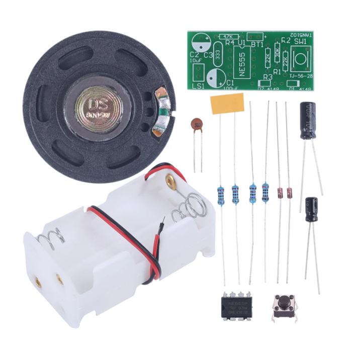 Jednostavni DIY kit za učenje lemljenja koji na kraju postaje zvono za ulazna vrata (ili sirena ako tipku brzo pritišćete i otpuštate). U paketu se nalazi pločica s oznakama komponenti i sve potrebne komponente, uključujući i zvučnik i držač za četiri AA baterije (baterije nisu uključene).
