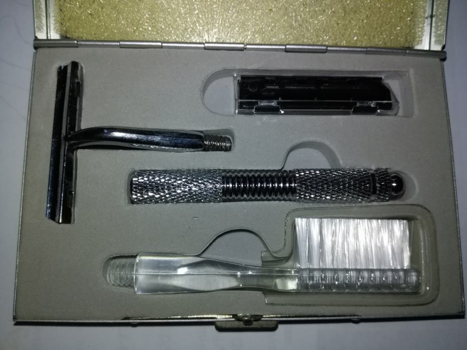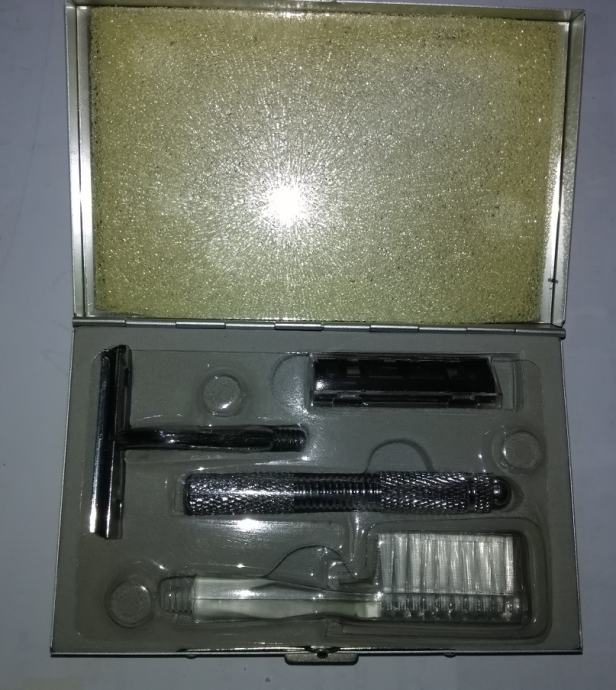 Praktičan komplet za svaku priliku, koji se sastoji od nožića za brijanje i četkice za zube. Sa unutrašnje strane ogledalo (iza spužvice). Novo.