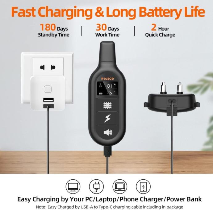 S punjenjem od 1-2 sata, ogrlica ima dug radni vijek. Prijemnik može raditi do 60 dana, dok daljinski upravljač traje do 30 dana, smanjujući potrebu za čestim punjenjem.