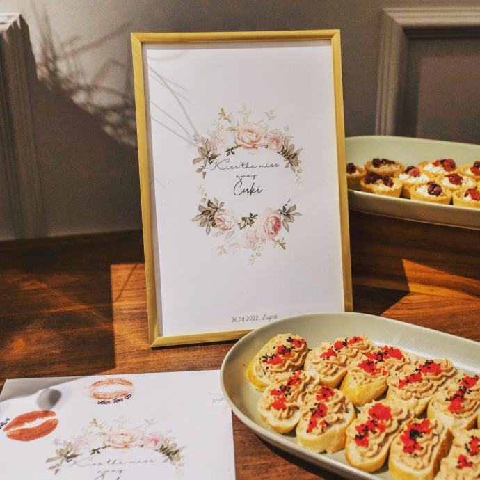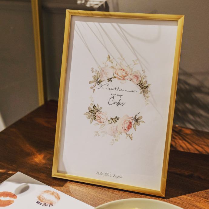 Kiss the miss away poklon za djevojačku za koju će svaka buduća mlada biti presretna. Personalizirani dizajn imena i datuma kao i lokacije za print u A3 ili A4 dimenziji.