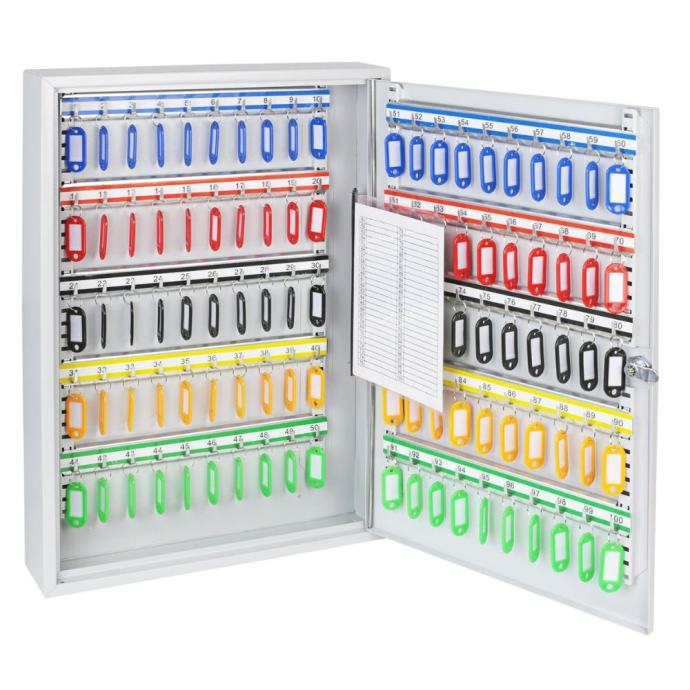 Ormarić je opremljen sigurnosnom cilindričnom bravom, a uz njega dolaze dva ključa koji osiguravaju maksimalnu sigurnost vaših ključeva. Osim toga, 10 podesivih tračnica omogućuju vam da lako prilagodite prostor za pohranu ključeva prema vlastitim potrebama. S 100 označenih privjesaka, lako ćete prepoznati svaki ključ, što vam štedi vrijeme i trud.