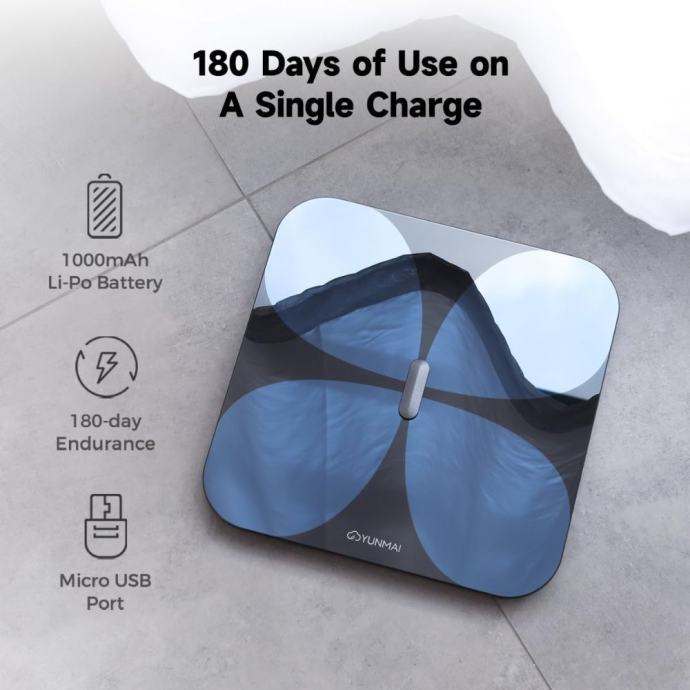 Dugotrajna baterija za bezbrižno korištenje do 180 dana: Vaga dolazi s ugrađenom litij-polimerskom baterijom kapaciteta 1000 mAh koja omogućuje do 180 dana rada s jednim punjenjem. Puni se standardnim MicroUSB priključkom, čime je eliminirana potreba za čestim zamjenama baterija – idealno za korisnike koji vole praktičnost i jednostavnost.