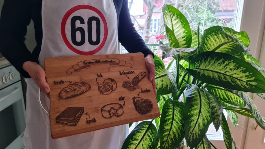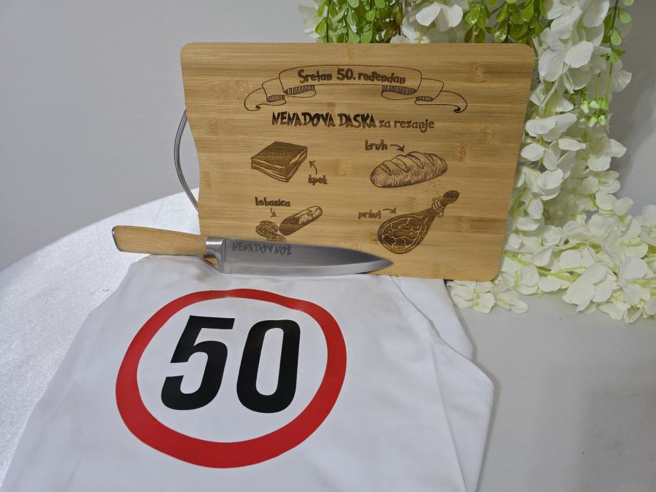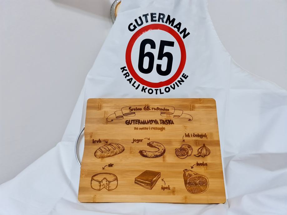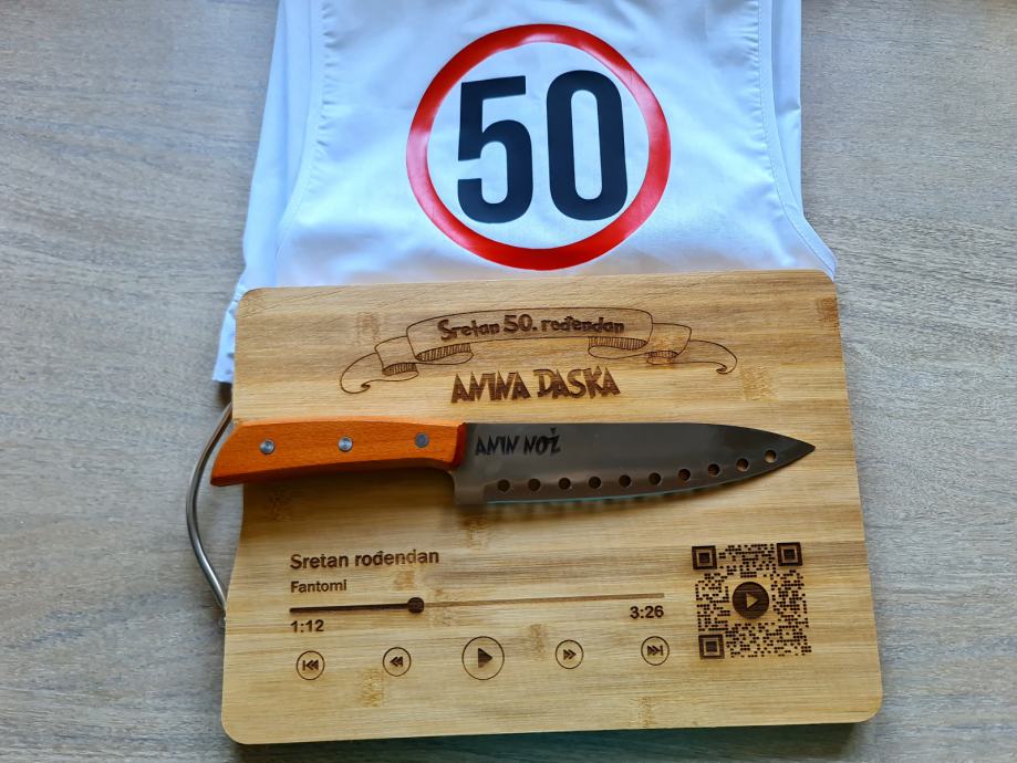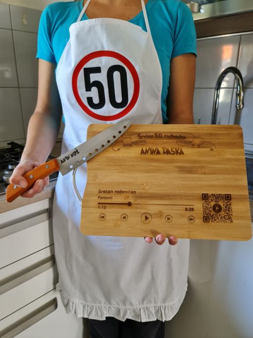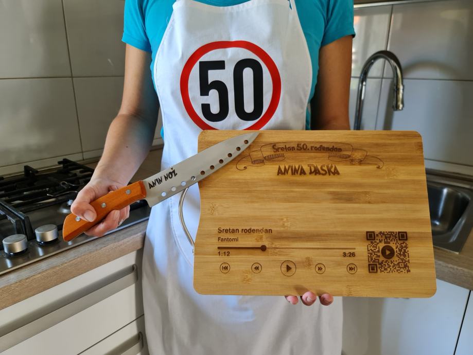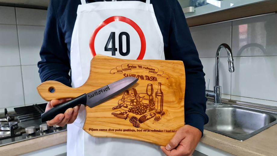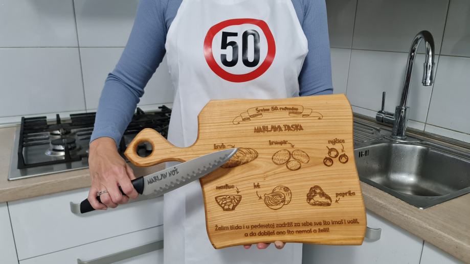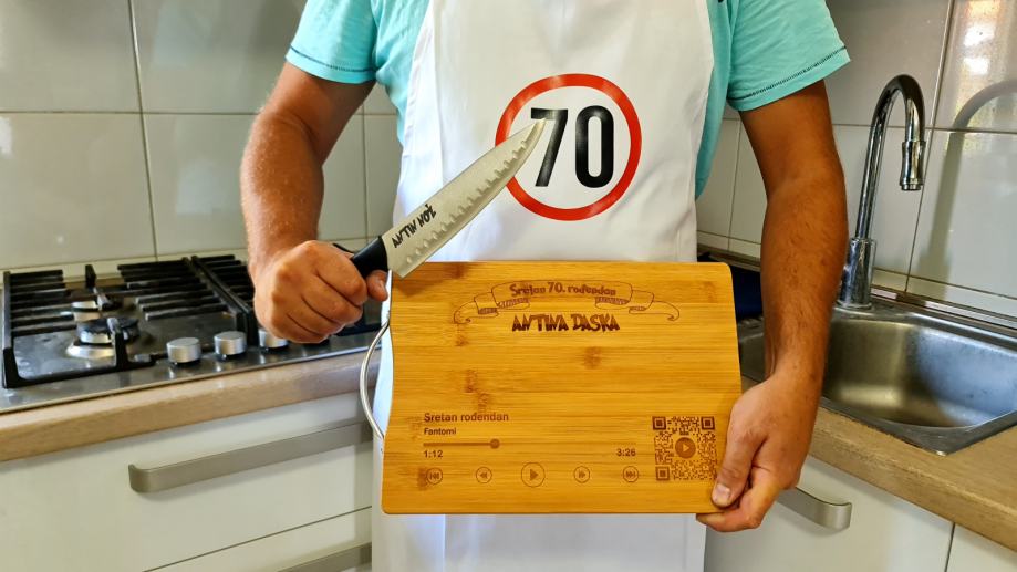 Prigodni personalizirani poklon set koji se sastoji od pregače, daske od bambusa dimenzije 34x24cm i noža.