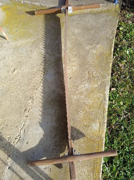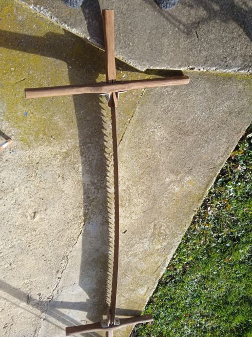 Ručna pila, testera, nekad davno služila za piljenje greda, rogova, debelih trupaca, sada za dekoraciju, ukupna dužina 230 cm, dužina reznog dijela 130 cm, širina rukohvata 53 cm