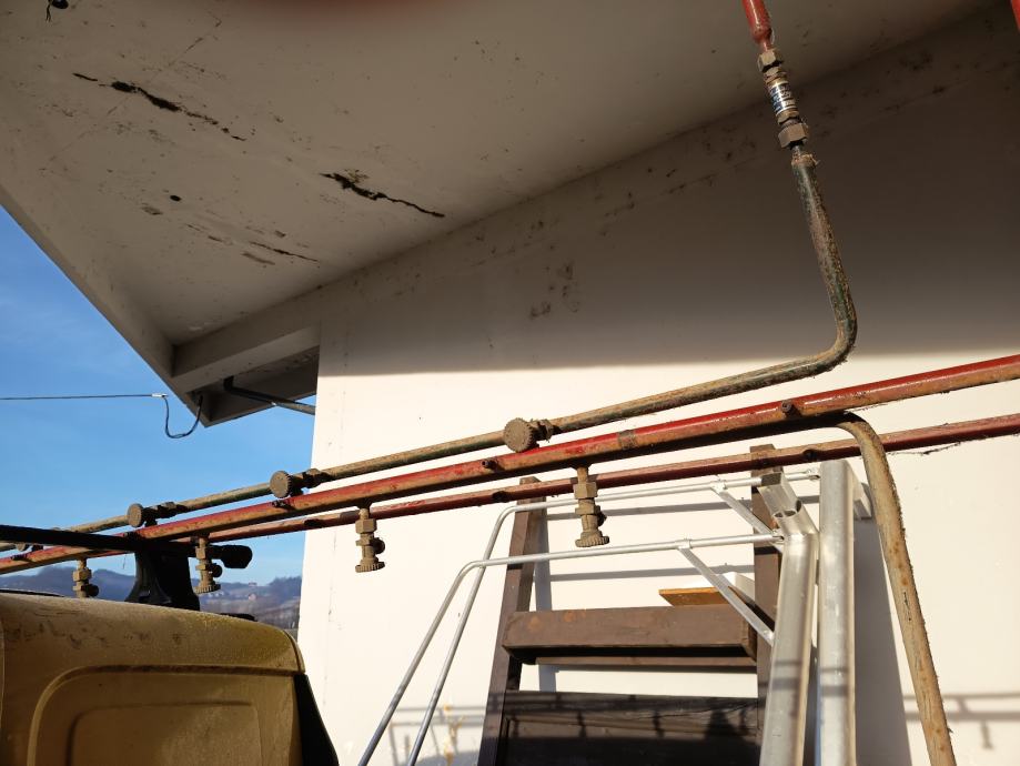 Prodajem rabljenu plinsku rampu. Radi se o kompletnom sustavu koji uključuje dvije crvene tlačne posude s manometrima i ventilima, montiranim na metalnom nosaču, te bakrene razvode cjevovoda. Sve komponente su spojene i čine funkcionalan sklop za distribuciju plina.