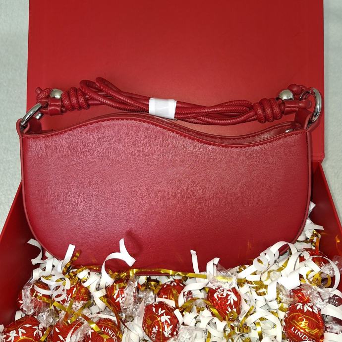 • Crvena torba od umjetne kože dimenzija 24,5 cm × 4 cm × 14 cm s dužinom remena od 60 cm