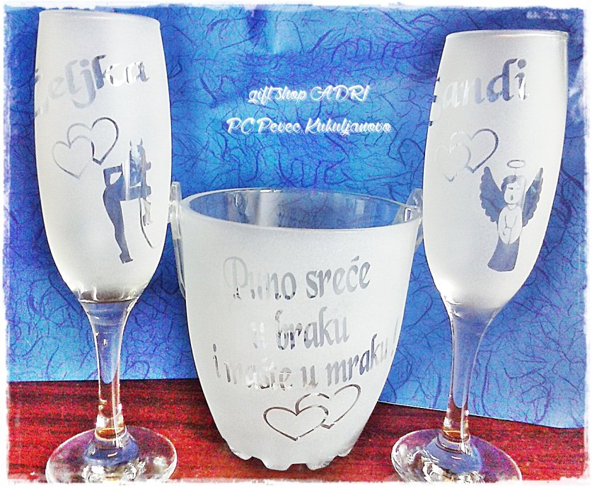 Lijep poklon može biti i komplet od 2 čaše za šampanjac sa posudom za led. Na čaše se mogu obrusiti imena mladenaca , a na posudu za led neka porukica i datum vjenčanja.