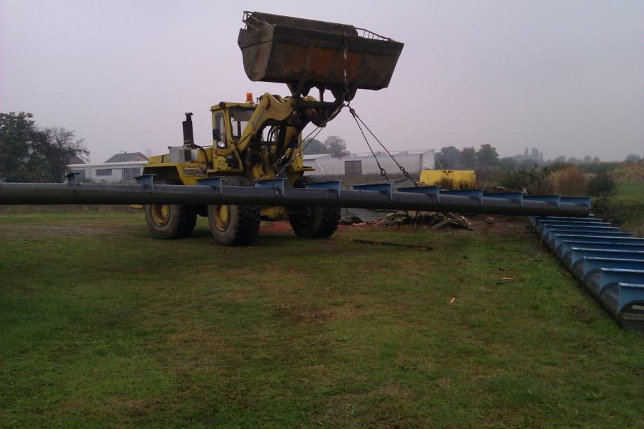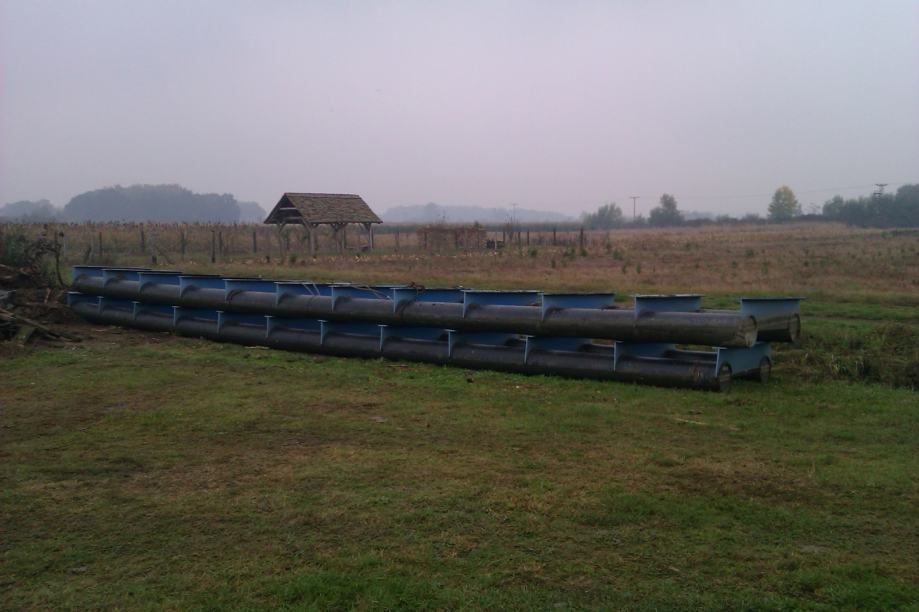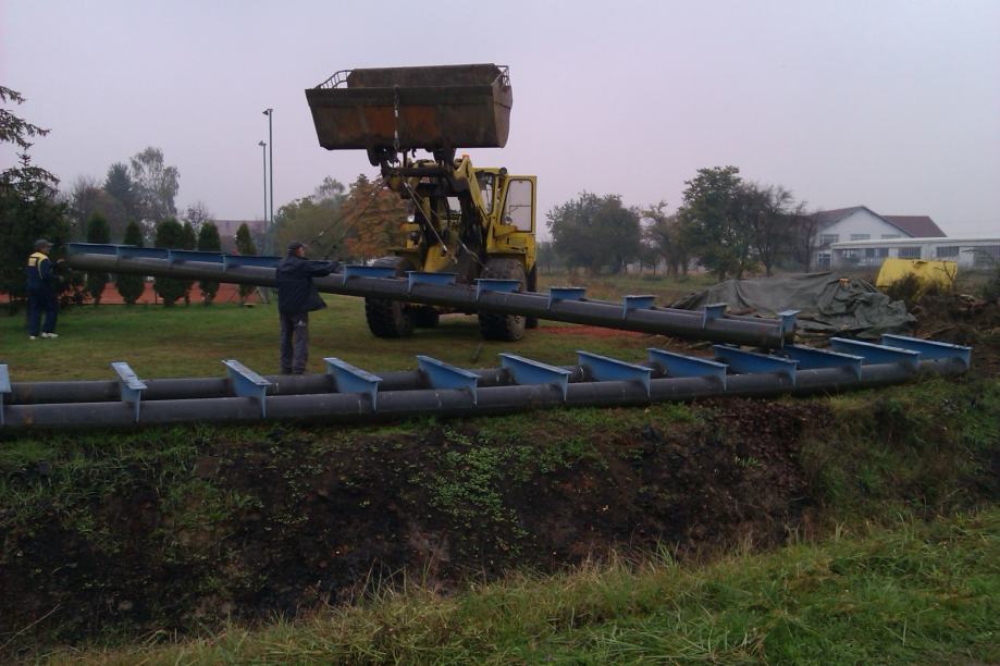 PLASTIČNI PONTONSKI MOST U 2 ELEMENTA. SVAKI ELEMENT SASTAVLJEN JE (IZVAREN) PLASTIČNIM CIJEVIMA DUŽINE 12 M. PRESJEK CIJEVI JE 310 mm, A DEBLJINA STJENKE CIJEVI JE 10 mm. NA CIJEVIMA SU NOSAČI NA KOJE SE MONTIRAJU DRVENE ŠTAFLE I DASKA. NOSIVOST PONTONA JE cca 700 kg. UZ MOST, KOJI JE U 2 ELEMENTA, SVAKI PO 12 m, POSTOJI I SPOJNICA, KOJA VEŽE OBA ELEMENTA, TE SE DOBIJE UKUPNA DUŽINA 25,5 m, TE 2 KRAKA, KOJA SE NASLANJAJU NA NASIP. TAKO SE SVEUKUPNO DOBIJE DUŽINA OD 30 M, A ŠIRINA MOSTA JE 1,5 m.