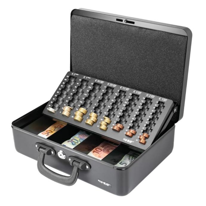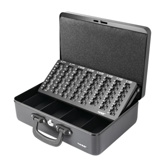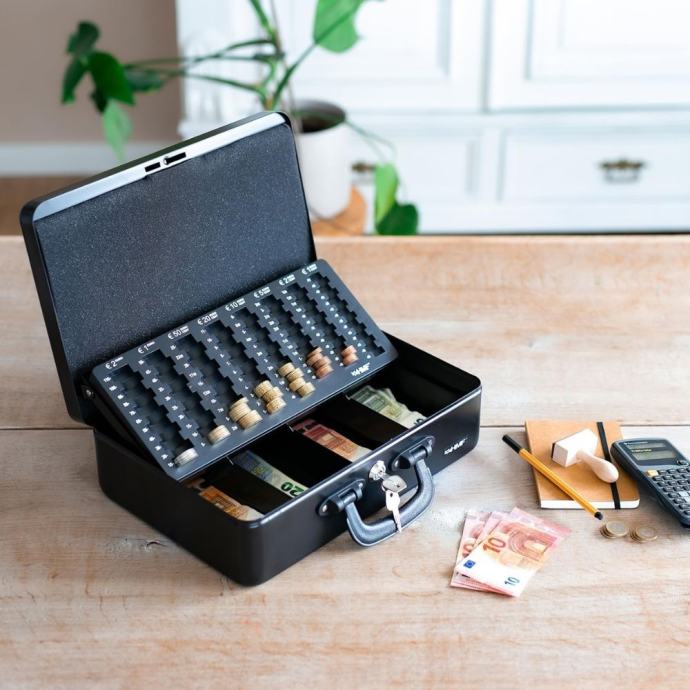 Za pohranu euro kovanica, ova kasa nudi umetak s osam odjeljaka koji su prilagođeni za kovanice od 1 centa do 2 eura. Umetak je osmišljen tako da omogućuje lako sortiranje kovanica i njihovo sigurno pohranjivanje, čime se štedi prostor i olakšava upravljanje.