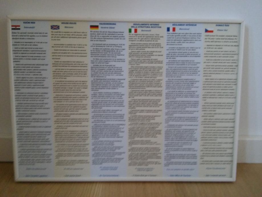 Kućni red, za apartmane koji se iznajmljuju turistima. Jezici: hrvatski, engleski, njemači, francuski, talijanski, češki.